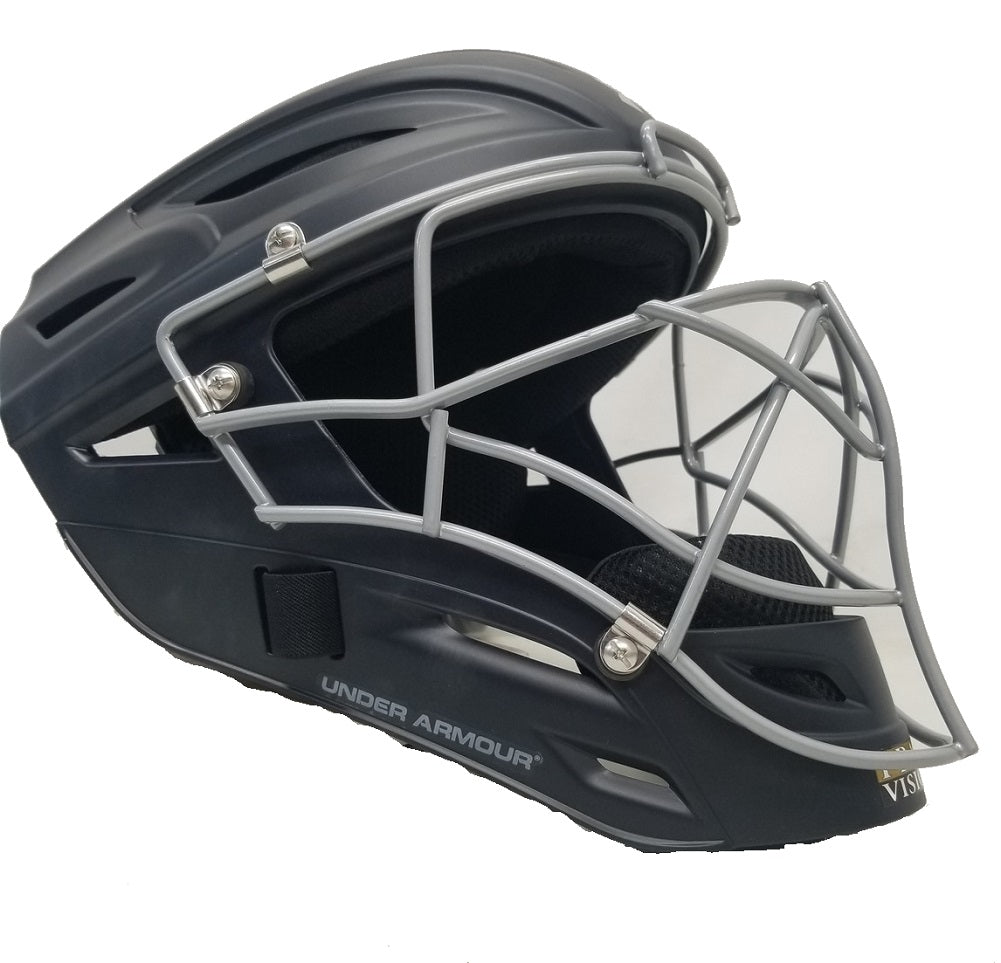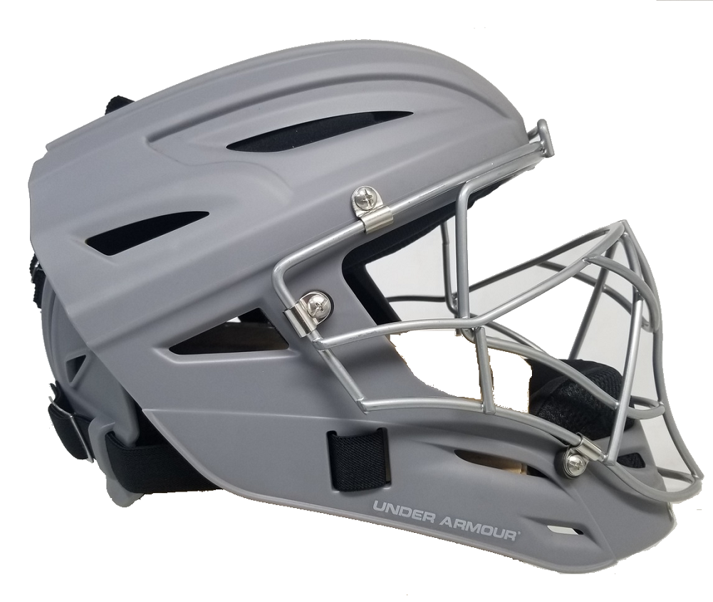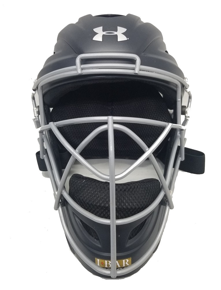 The Under Armour Youth Pro Style Catcher's Helmet Matte Finish GRAPHITE (Ages 7-12) features a matte painted mask featuring a high impact resistant ABS plastic shell designed to deflect and absorb impacts. I-BAR VISION steel cage increases player’s sight lines by using flattened bars which also increase the strength of the cage. Soft, breathable, moisture wicking, and machine washable liner...