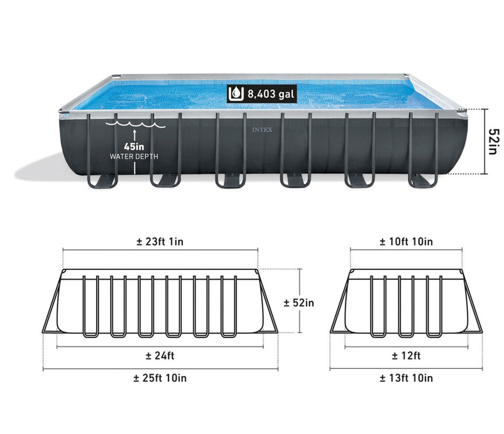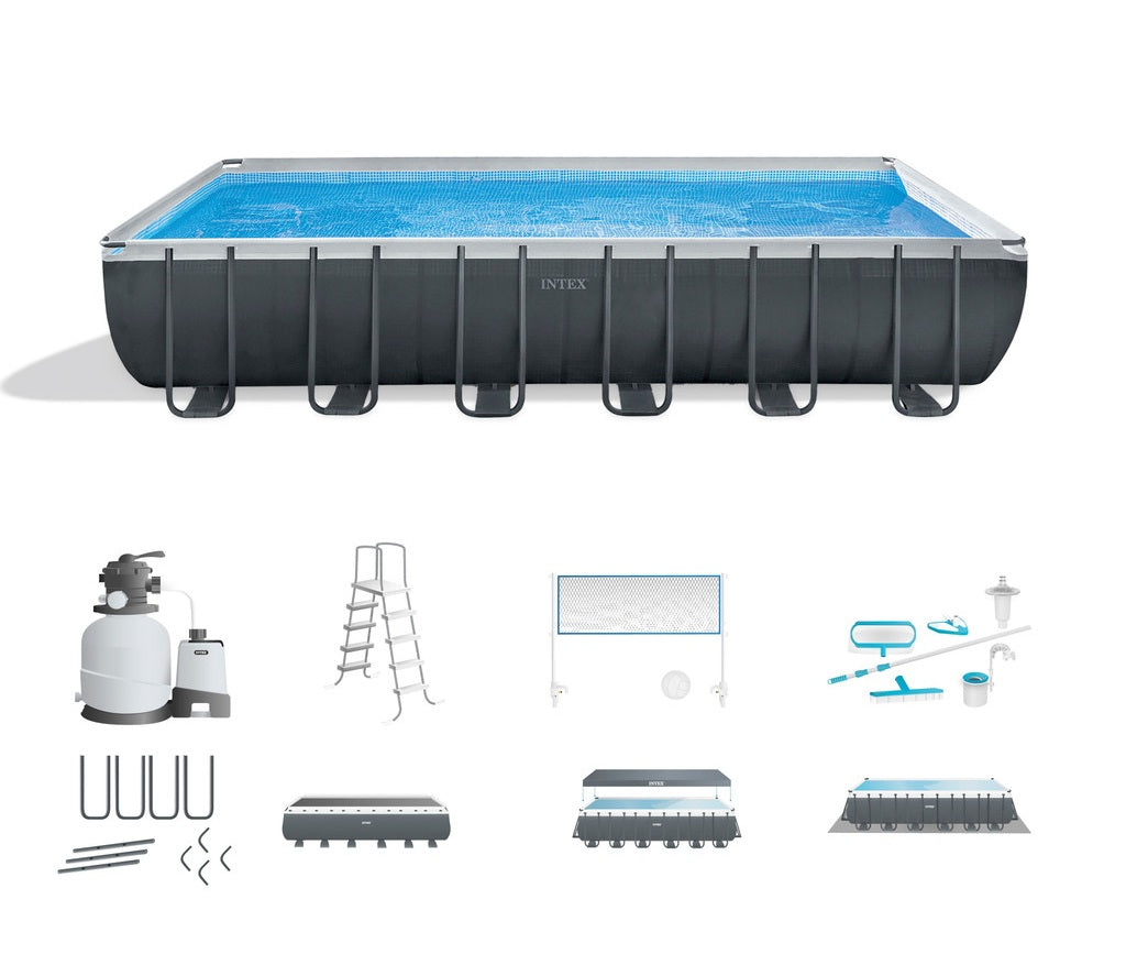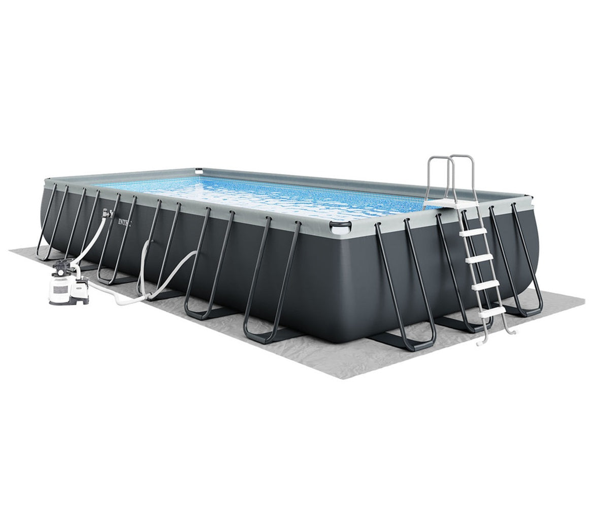 Have an amazing time with family and friends with the spacious Intex 24' x 12' x 52" Ultra Frame Rectangular Above Ground Pool Set. Engineered for strength, the Ultra Frame pool is supported by strong, durable sturdy frames which are powder coated for rust resistance and beauty. Your backyard will be the place to be all summer as your family...