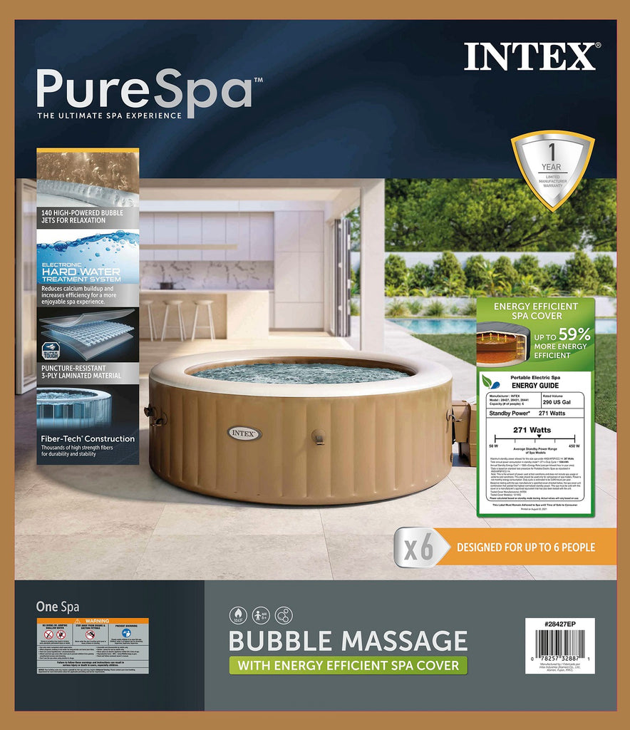 The Intex PureSpa Bubble Massage Spa provides relaxation at the touch of a button. The easy-to-use control panel activate the high performance bubble jets surrounding the interior of the spa for a refreshing massage. The heating system adjusts to fit your personal temperature preference allowing a stress-free spa experience. The built-in hard water treatment system makes water gentler on skin...