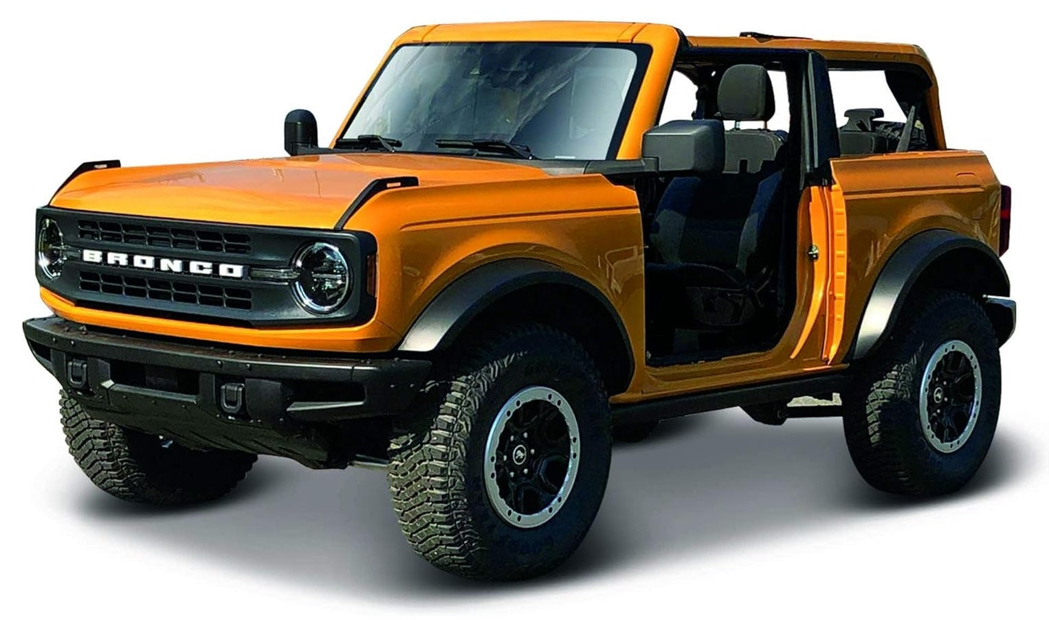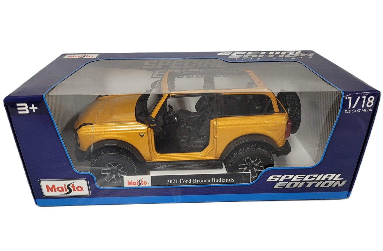 The Maisto Special Edition 2021 Ford Bronco Badlands Orange 1:18 Diecast Vehicle is a detailed die-cast model. Large Approx. 9" Replica with die-cast metal body with plastic parts. Opening doors and engine compartment. Full function steering with four-wheel suspension. Adjustable seat backs on some models. Detailed chassis with separate exhaust system. Mounted on plastic stand. 1/18 Die-cast metal. For ages...