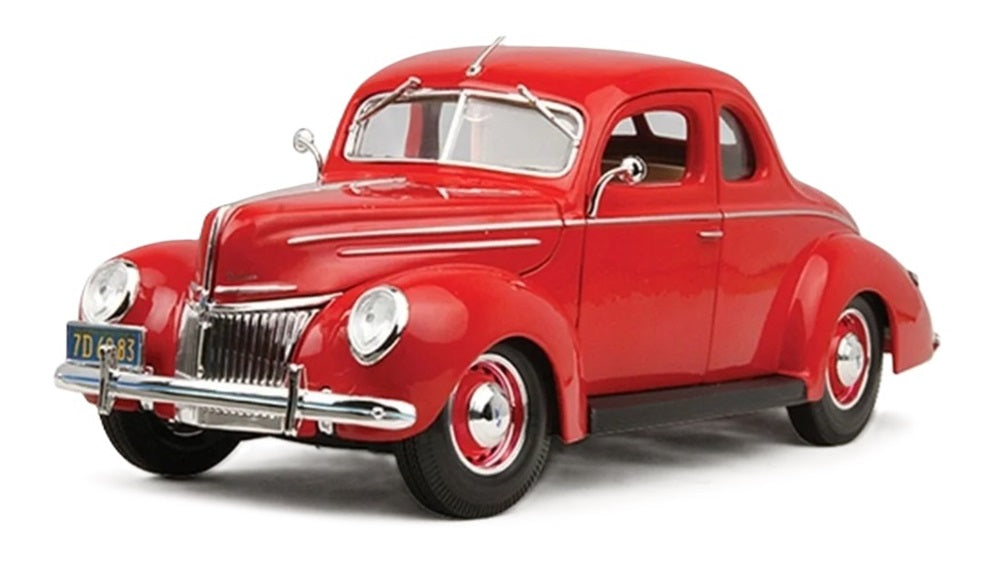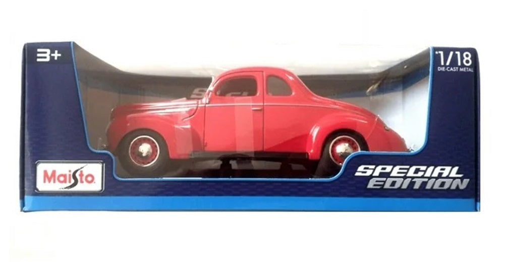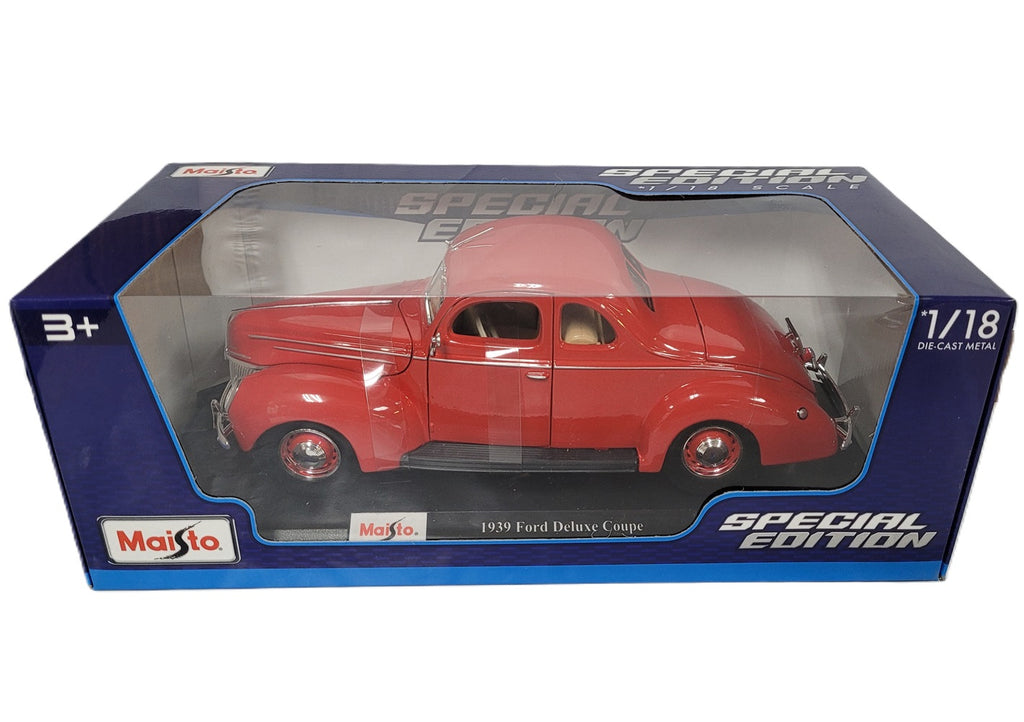 The Maisto Special Edition 1939 Ford Deluxe Coupe Red 1:18 Diecast Vehicle is a detailed die-cast model. Large Approx. 10" Replica with die-cast metal body with plastic parts. Opening doors and engine compartment. Full function steering with four-wheel suspension. Adjustable seat backs on some models. Detailed chassis with separate exhaust system. Mounted on plastic stand. 1/18 Die-cast metal. For ages...