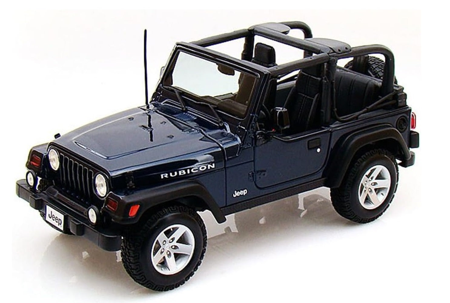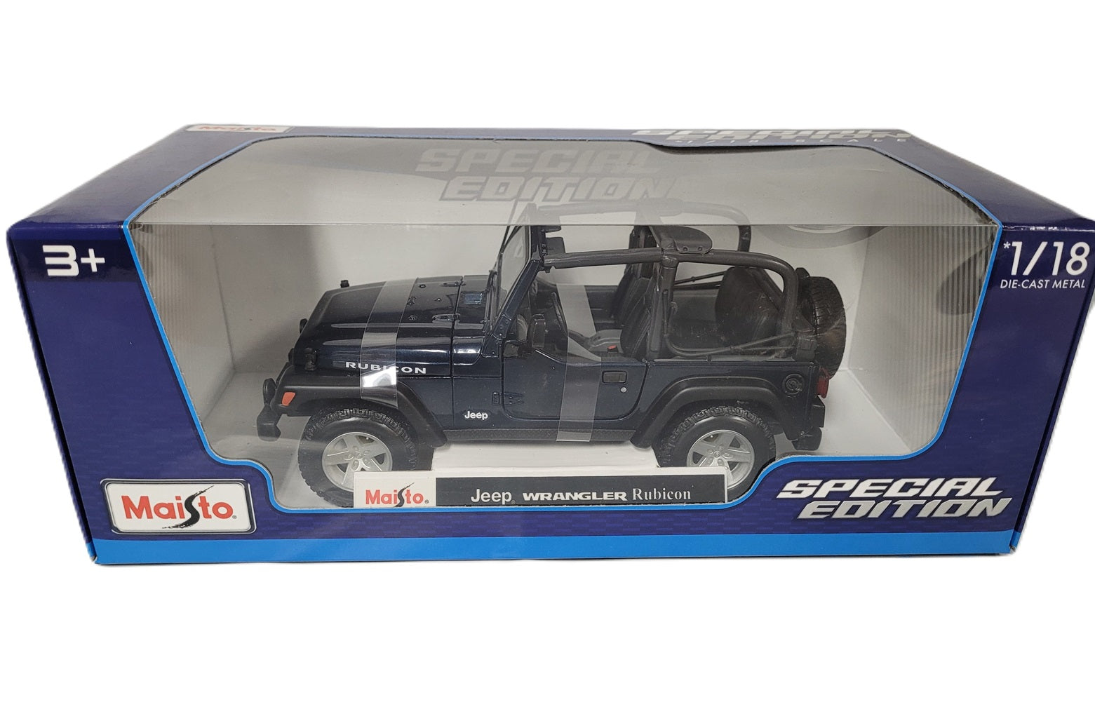 The Maisto Special Edition 1:18 Jeep Wrangler Rubicon Midnight Blue Diecast Vehicle is a detailed die-cast model. Large Approx. 9" Replica with die-cast metal body with plastic parts. Opening doors and engine compartment. Full function steering with four-wheel suspension. Adjustable seat backs on some models. Detailed chassis with separate exhaust system. Mounted on plastic stand. 1/18 Die-cast metal. For ages...
