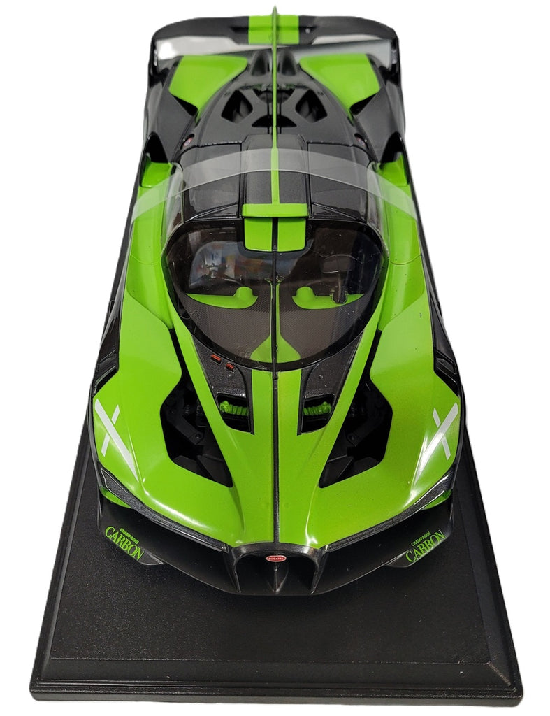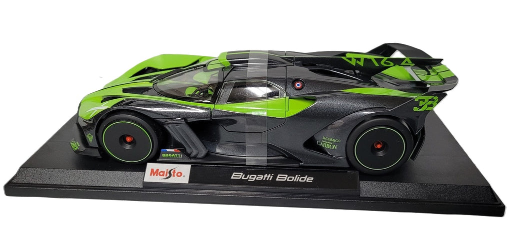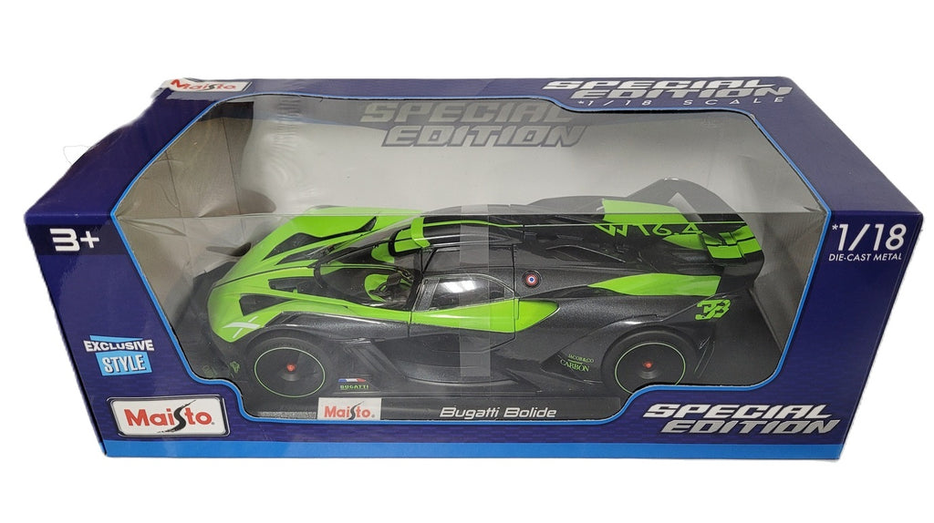 The Maisto Special Edition 2022 Bugatti Bolide Green and Black 1:18 Diecast Model is a detailed die-cast model. Large Approx. 9-1/2" Replica with die-cast metal body with plastic parts. Opening doors and engine compartment. Full function steering with four-wheel suspension. Adjustable seat backs on some models. Detailed chassis with separate exhaust system. Mounted on plastic stand. 1/18 Die-cast metal. For...
