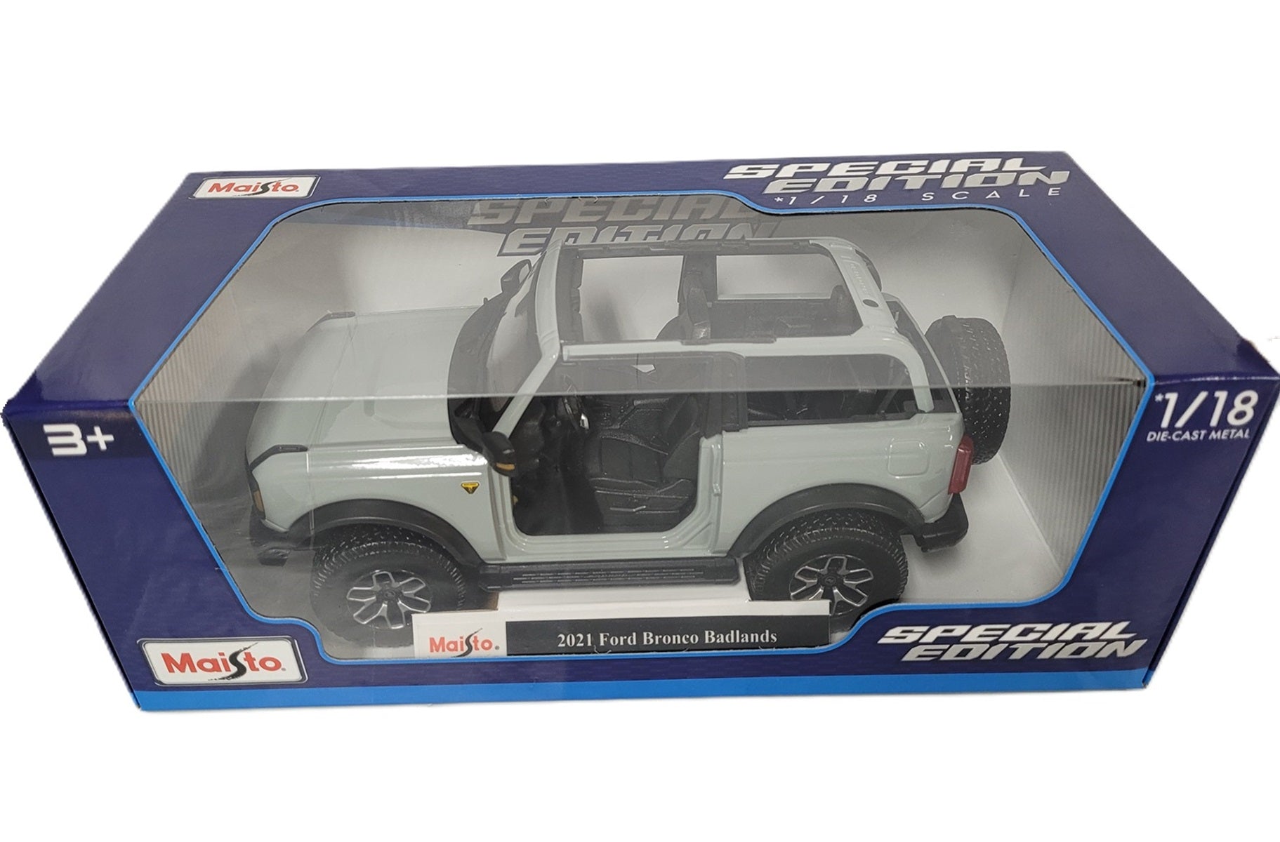The Maisto Special Edition 2021 Ford Bronco Badlands Gray 1:18 Diecast Vehicle is a detailed die-cast model. Large Approx. 9" Replica with die-cast metal body with plastic parts. Opening doors and engine compartment. Full function steering with four-wheel suspension. Adjustable seat backs on some models. Detailed chassis with separate exhaust system. Mounted on plastic stand. 1/18 Die-cast metal. For ages...