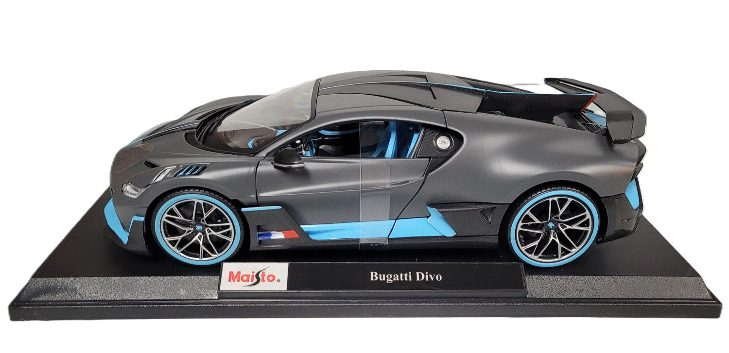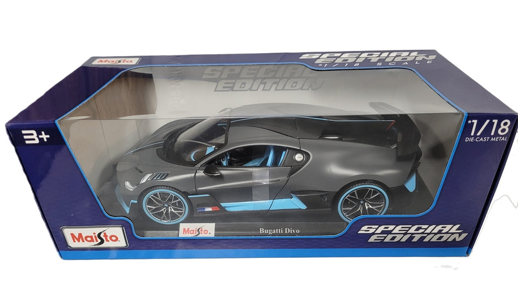 The Maisto Special Edition 2022 Bugatti Divo Gray with Blue 1:18 Diecast Model is a detailed die-cast model. Large Approx. 9-1/2" Replica with die-cast metal body with plastic parts. Opening doors and engine compartment. Full function steering with four-wheel suspension. Adjustable seat backs on some models. Detailed chassis with separate exhaust system. Mounted on plastic stand. 1/18 Die-cast metal. For...