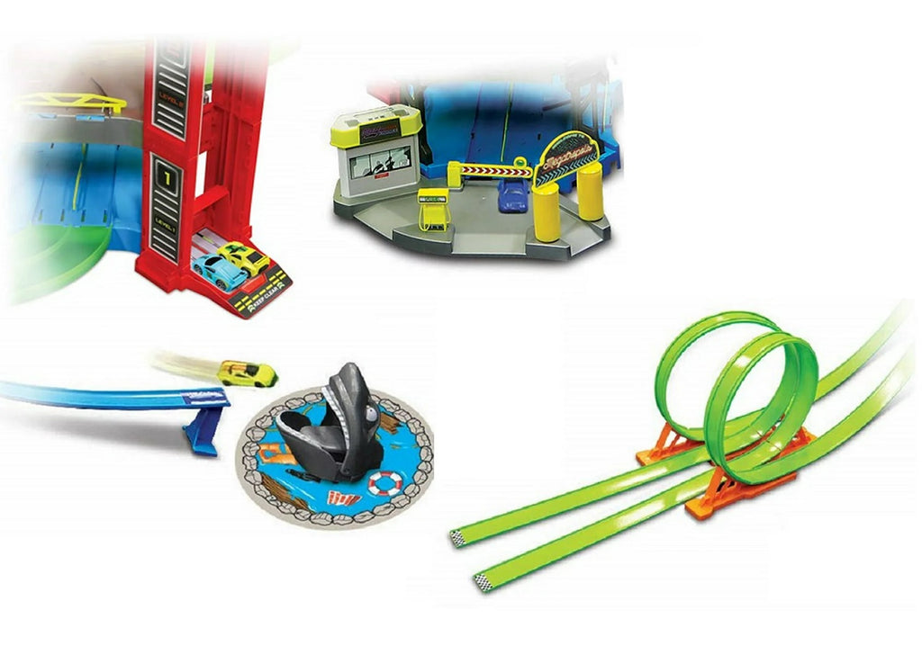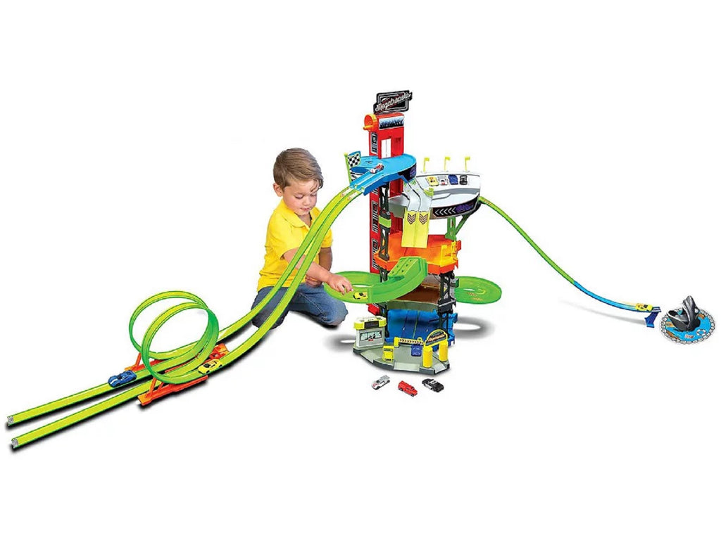The Maisto Fresh Metal Megatropolis Mega Playset is a ginormous playset with a 5-level mega city. Display your cars, take the dual car elevator or drop down one of the many tracks for some racing fun. This deluxe playset has everything - a parking garage, two-lane raceway, dual loops, car wash, and yes, even a shark! Take a spin, but...