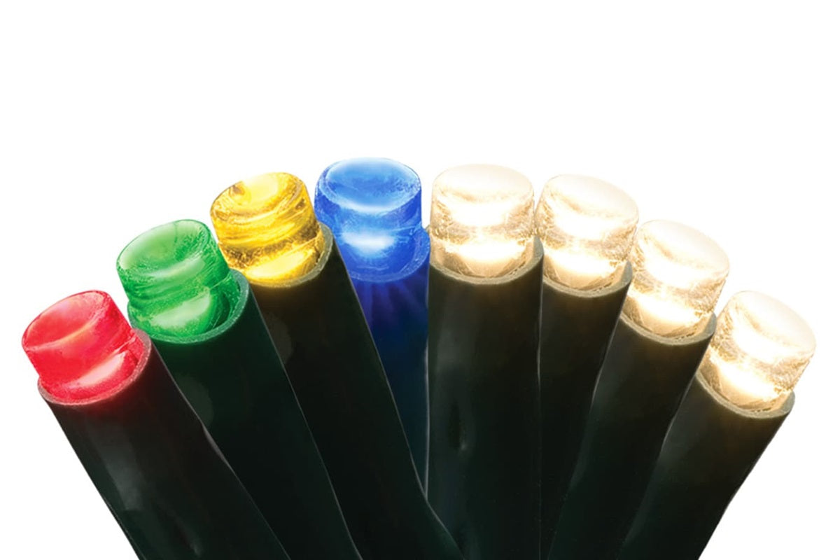 GE Color Choice LED MicroBright 150-count color changing light set on storage reel. Use the control box to choose between red, warm white, or light show settings. 36-Inch lead wire, 3.5-inch lamp spacing, 4-inch coaxial end connector, 43.4-feet lighted length, and green cord set. Can connect up to 4 sets. Features 8 in 1 Lighting Effects: multi, warm white or...