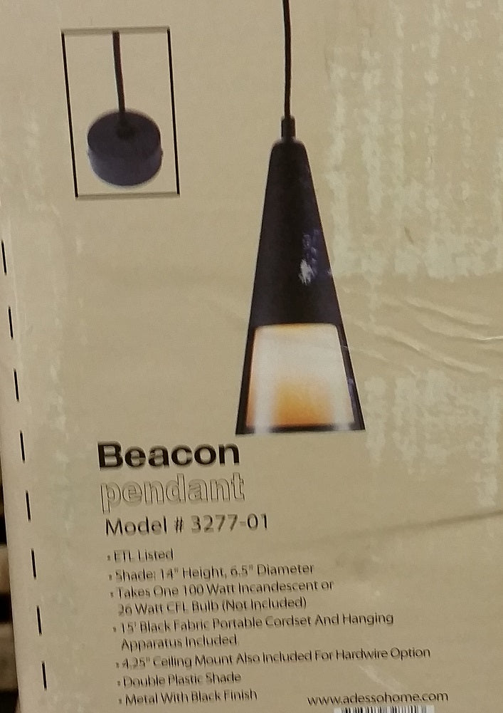 The Adesso 3277-01 Beacon Pendant features a woven fabric cord that matches the lamp color. The shades are powder coated metal at the socket end with smoked acrylic on the open end lined with a white acrylic inner shade. These pendants are intended for hardwire installation. Each includes a 15-foot long matching cord set attached to a metal ceiling mount...