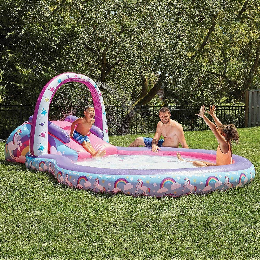 Inflatable Unicorn Park Pool & Slide 150" x 90" x 55" is the perfect way for your entire family to combine relaxation and recreation in your own backyard. Kids and adults will enjoy splashing in the sun with this unique giant portable pool with a cooling crow’s nest sprayer. The sprayer is fed directly from an easily connected standard garden...