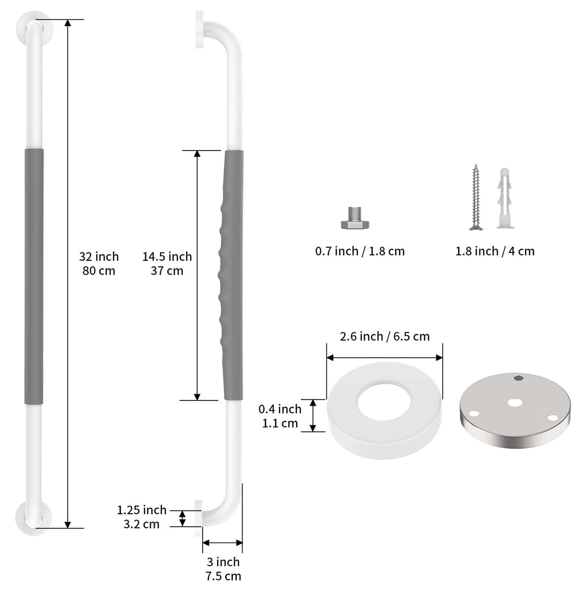 MUNZONG 32in White Shower Grab Bar w/ Gray Anti-Slip Rubber Grip the non slip knurled surface on middle is superior for safety when you have soapy hands and need to steady yourself. Munzong 32 inch knurled surface bathroom shower grab bars 1.25 inch diameter are able to support up to 500 lbs of pull force to provide a stable, reliable...