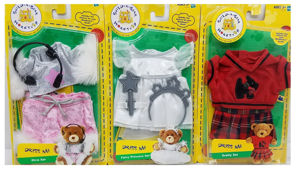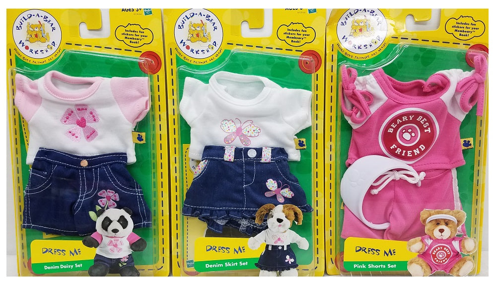 12-Piece Build-A-Bear Workshop Items - 9 Dress Me Outfits & 3 Accessorize Me - Have a Bear-rific Time dressing your Bear with the Build-A-Bear Workshop Friends, outfits and accessories. The Build-A-Bear Workshop is where best friends are made! This 12-Piece set gives your child hours of imagination, cognitive skills, and making friends! All packages includes fun stickers for your Memory Books! Get 9 tops, 9 bottoms, head pieces, hats, bags, shoes, panties, slippers, and more. Ages 3+ Years. 9 Dress Me Sets Included: Pink Leopard PJ Set, Pink Shorts Set, Denim Skirt Set, Denim Daisy Set, Diva Set, Sparkle Jog Set, Beary Beautiful Set, Scotty Set & Fairy Princess Set. 3 Accessorize Me Sets: Girls Panties and Slippers, Beautify, & Beary Beautiful. NOTE: Build-A-Bear Buddies clothing and accessory items only fit Build-A-Bear Buddies miniature furry friends.