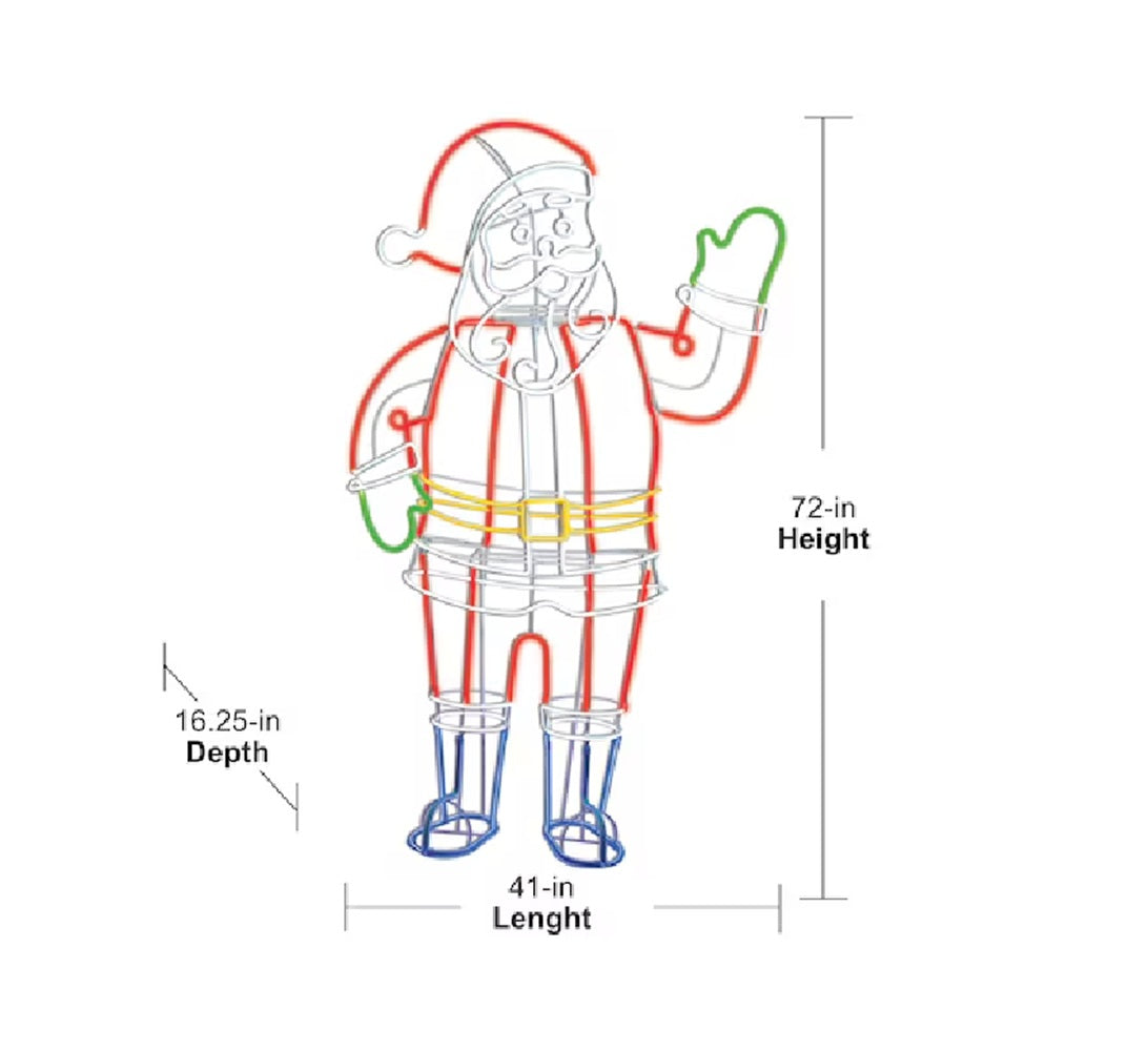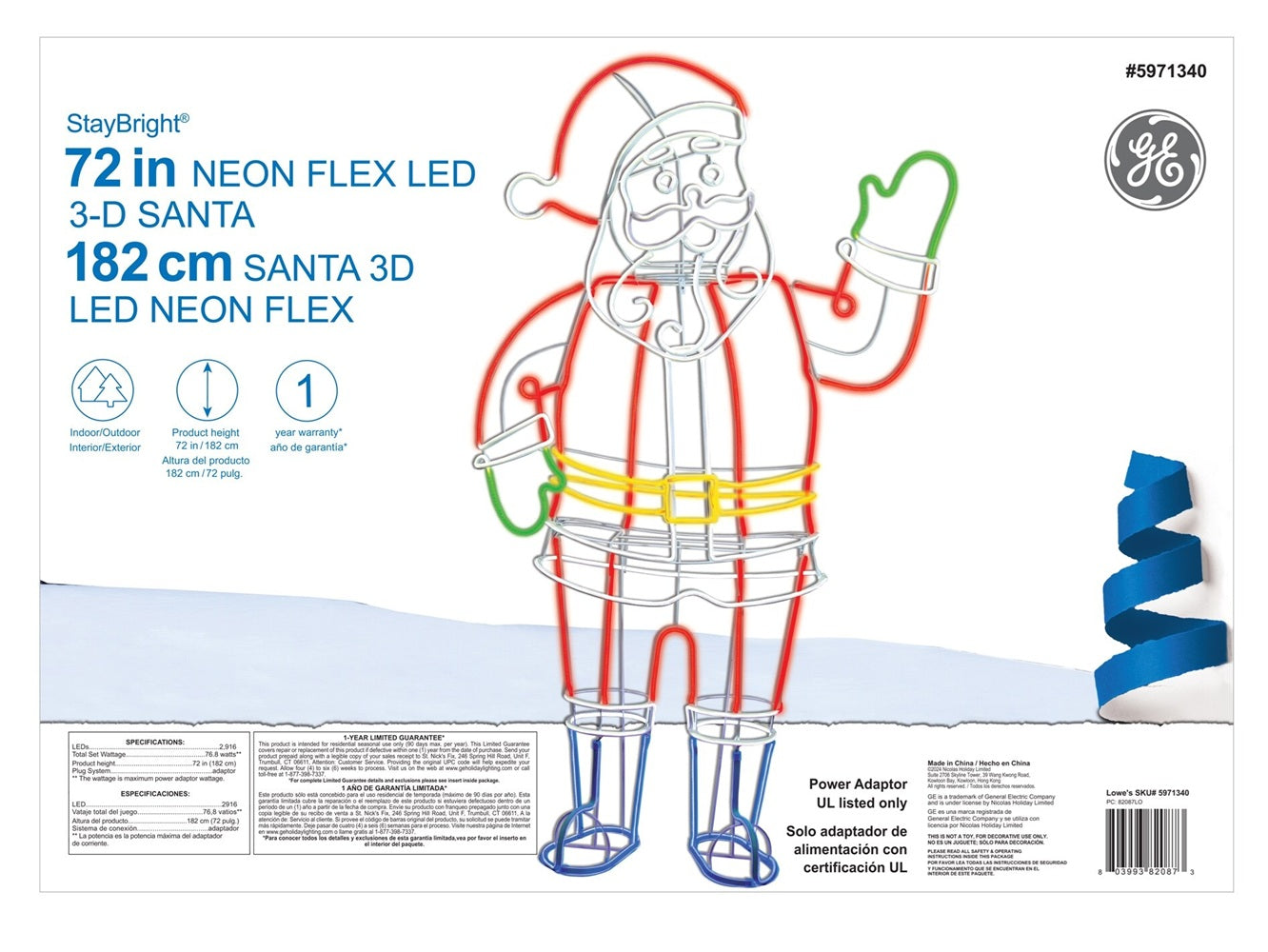 This head-turning yard sculpture will be the star of your holiday display. The GE StayBright 72-In tall Santa, 2916 blue, white, gold, red and green neon flex LED lights, 60-In white lead wire with UL listed adapter, includes 4 stakes. The statue stands on a metal frame and secures with the included yard stakes. This neon sculpture is weather-resistant. The classic Santa stands tall greeting passer-byers in red wears boots, green gloves, and yellow belt. Perfect for indoor or outdoor spaces. The long-lasting LED bulbs remain cool to the touch and will shine through the season. Cord length 5-feet length. Dimensions: 72" H X 41" L X 16.25" W