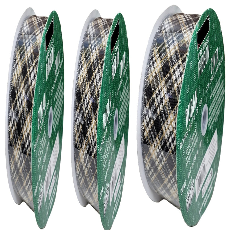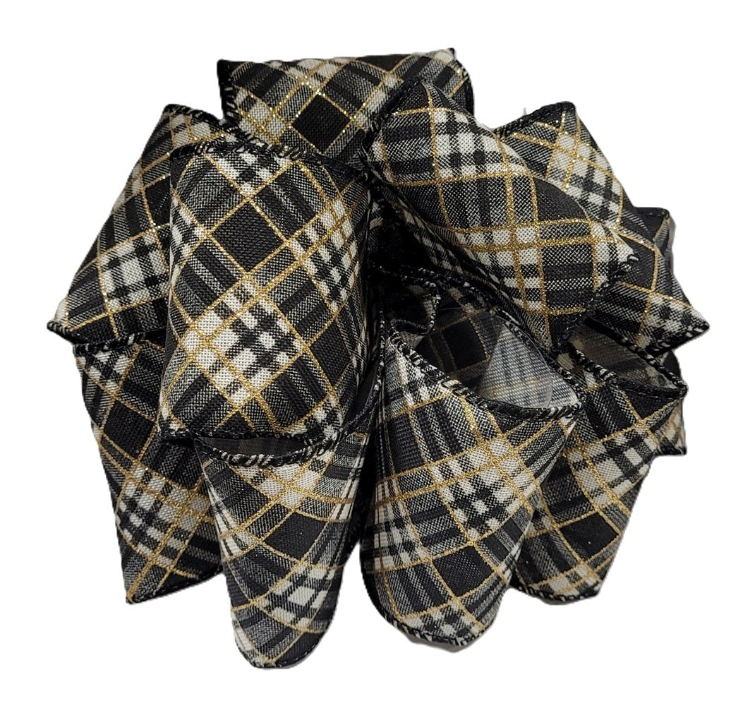 The Wire-Edged 2.5-inch Christmas Black Plaid with Gold Accent Lines is a beautiful spool of ribbon to create beautiful bows for your Christmas gifts or to adorn your Christmas tree, mantle or stairway. This premium stylish holiday ribbon has been carefully selected. This black and white plaid ribbon and features gold line accents is high-quality, finish-stitched gold edges. Made from durable, fine polyester fabric, finely woven and lasts a long time. The ribbon is wire-edged perfect for crafts, gift packaging, and more. 2.5-inch width X 50 yards length.