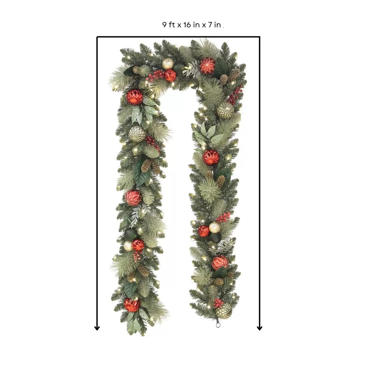 - Pre-Lit 9-FT Faux Garland decorated with red and gold accents