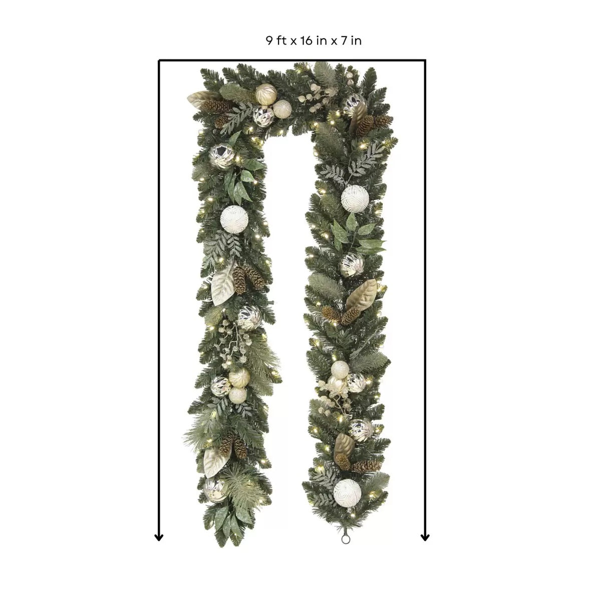 Take your holiday decor to the next level with our CG Hunter Faux 9-foot Pre-Lit Garland. The garland is beautifully decorated in silver and gold and pre-lit with 90 warm white lights to bring holiday joy to your space. Crafted from the highest quality materials, this garland offers both durability and beauty, featuring hand-selected decorations that capture the essence of the season. Perfect for mantles, banisters, or entryways, our garland is ready to display, bringing holiday cheer and warmth to your home year after year.