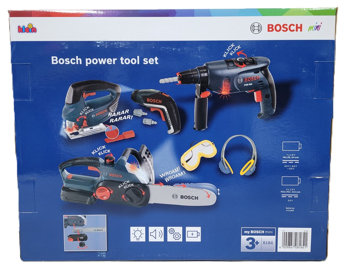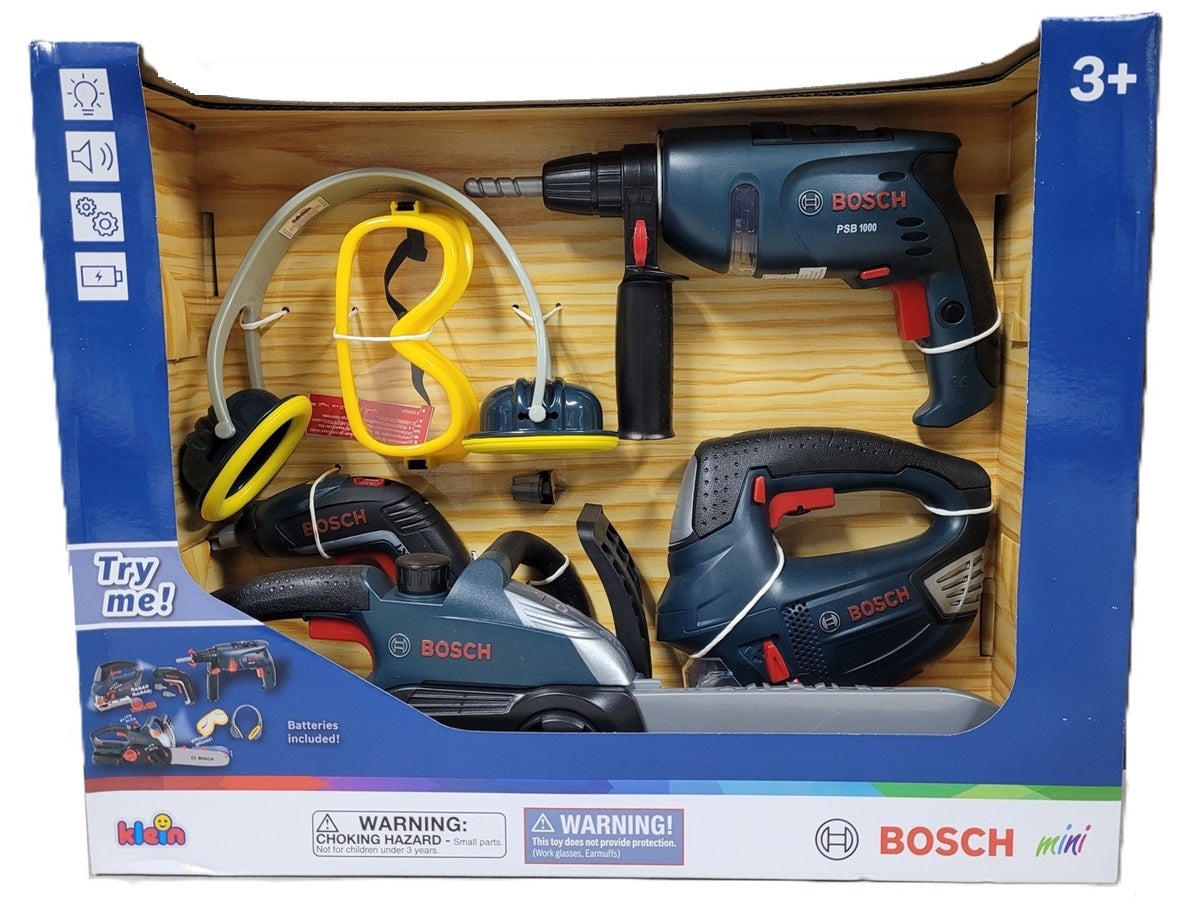Let them play like the big kids with the Bosch Big Power 4-Tool Mini Play Set and Accessories. This kid's tool set features kid-friendly versions of all the power tools you've got in your garage. This Bosch Power Tool Set offers hours of fun and play for little builders. Get 4 battery-operated tools. The set also comes with Bosch earmuffs and work glasses. Batteries are included. These toy tools have realistic play functions and are complete with lights and sounds. Get ready to play!