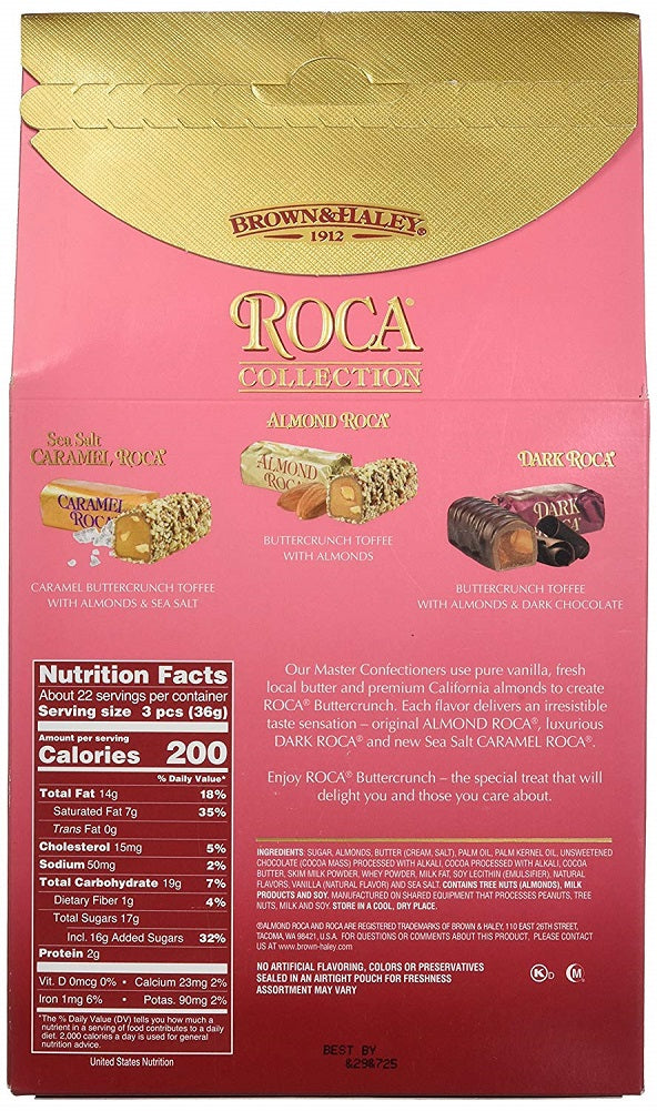 Enjoy the Buttercrunch - the special treat that will delight you and those you care about with the Brown & Haley Roca Original Buttercrunch Toffee Caramel/Almond/Dark Roca 63-pc. Sea Salt Caramel Roca - Caramel Buttercrunch Toffee with Almonds & Sea Salt. Almond Rock - Buttercrunch Toffee with Almonds. Dark Roca - Buttercrunch Toffee with Almonds & Dark Chocolate.