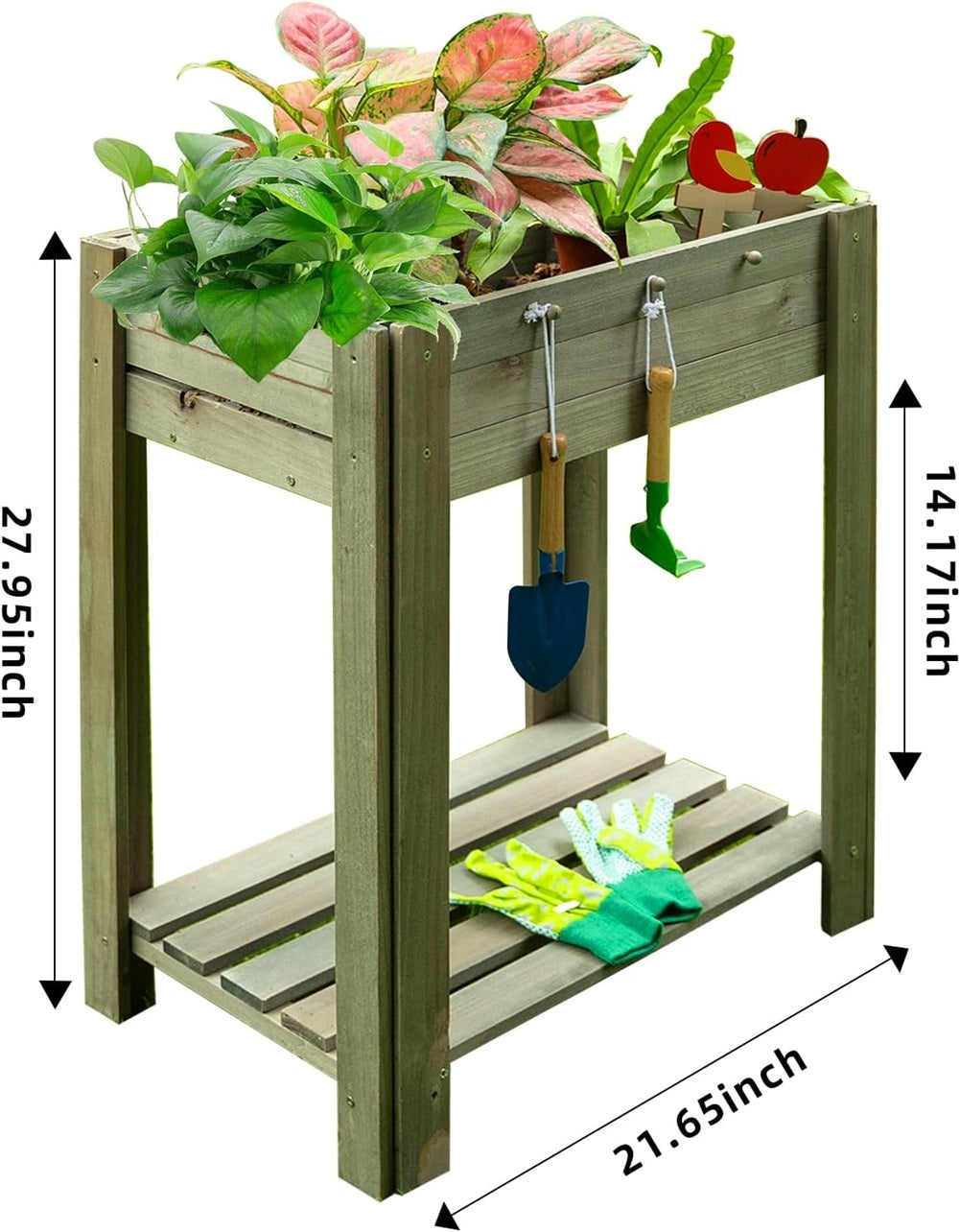 The Children's Wooden Gardening Stand Play Set with Accessories allows your child's imagination to run wild. This plant stand is the perfect height to encourage your child to nourish plants and provide interactive play. Standing at 27.95", it is the perfect height for your child to see plants grow. The stand is 21.65"L X 14.17"W, perfect to create a small garden or add plants. The planter box is stable and durable, made of wood. The set includes gardening tools: child's shovel, child's rake and gloves. Measures 27.95"H X 21.65"L X 14.17"W. Plants NOT included