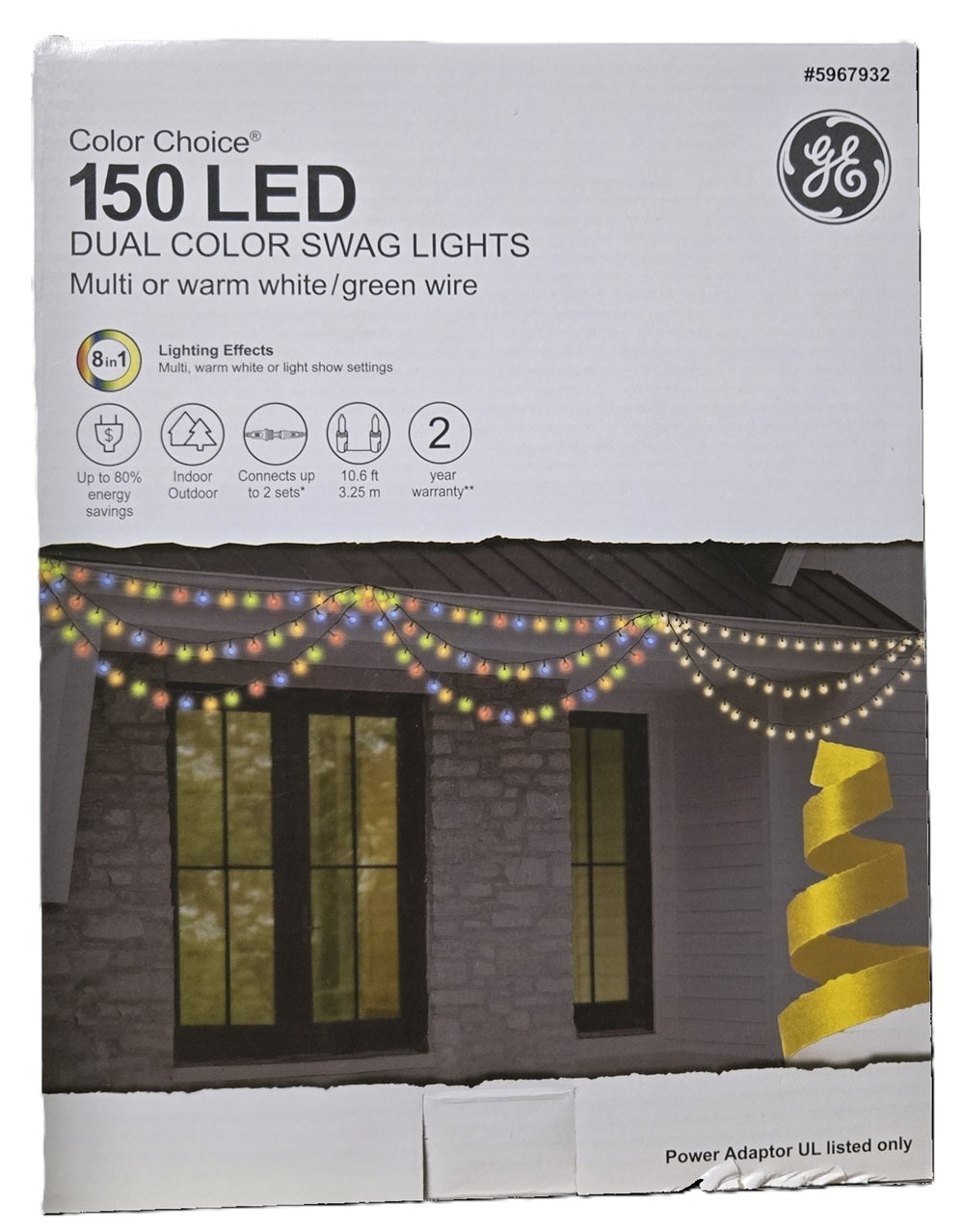 • GE 150-Count Swag LED color changing lights, use control box to choose between warm white, multicolor, or light show settings