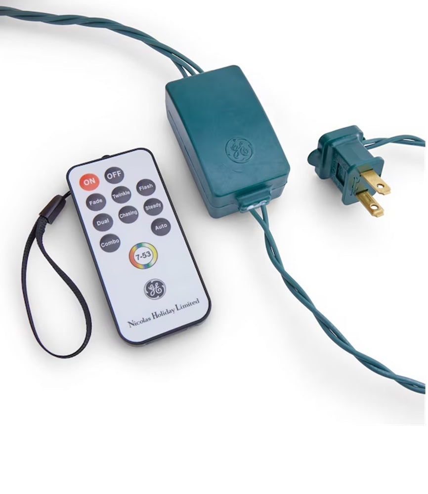GE Color Effects LED C9 faceted 50-count RGB light set. Use the remote control to choose between 7 colors, 53 functions, and 8 operating modes with sync for a color changing light show. 24-Inch lead wire, 8-inch bulb spacing, 4-inch end connector, 32.6-feet lighted length, and green cord set. Features: GE C9 LED diamond cut RGB remote controlled Christmas string lights. 50-Count, RGB LED Christmas lights - use remote control to choose between 7 colors, 53 functions, and 8 operating modes with sync for a color changing light show. 32.6-Feet lighted length, green cord with fused plug. Can connect up to 5 sets. Replacement bulbs and fuses included for added convenience. For indoor or outdoor use