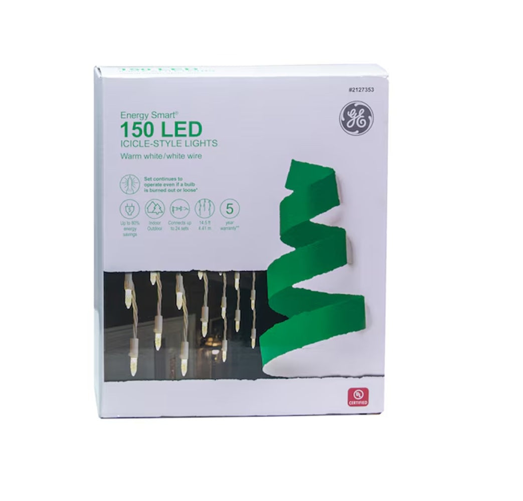 GE Energy Smart ConstantON LED 7-mm diamond cut 150-count warm white icicle lights. 6-Inch lead wire, 3.5-inch lamp spacing, 6-inch strand spacing, 6-inch end connector plug, 14.5-feet lighted length, and white cord set with fused plug. GE 7-mm LED diamond cut Christmas icicle lights features 150-Count, warm white ConstantON LED lights continue to operate even if a bulb is burned out or loose. 14.5-Feet lighted length, white cord with fused plug. Can connect up to 24 sets. Replacement bulbs and fuses included for added convenience. For indoor or outdoor use