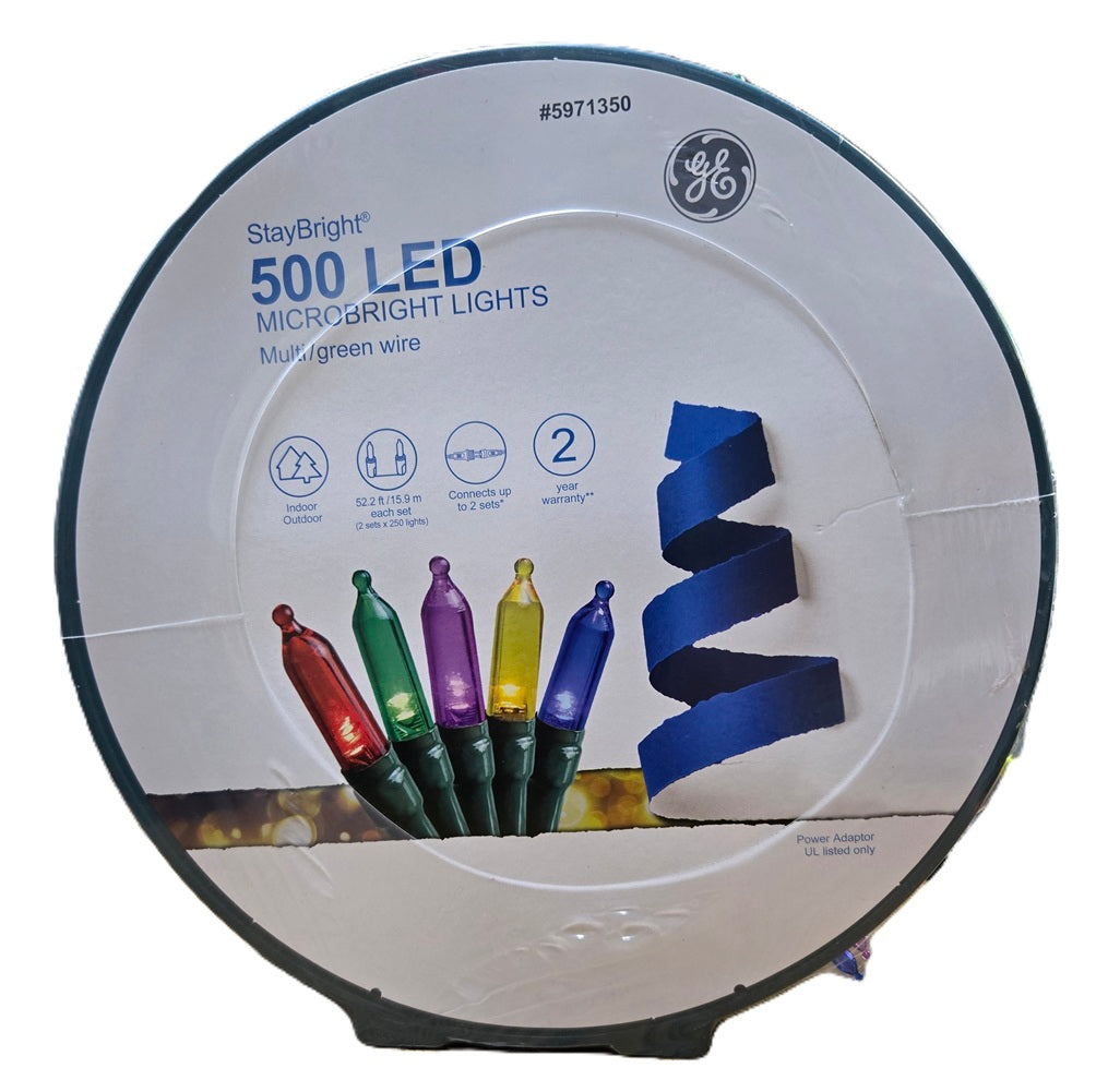 Decorate for the season with the GE MicroBright Multicolor Christmas string lights on a storage reel (2 strands of 250-lights) MicroBright multicolor light set. These lights are perfect to decorate a Christmas tree, decorate a manual, or the exterior of your home. 36-Inch lead wire, 2.5-inch lamp spacing, 4-inch coaxial end connector. 104.4-feet total lighted length, 24 gauge green cord set with UL Listed Adapter. Can connect up to 2 sets. Indoor or outdoor use.