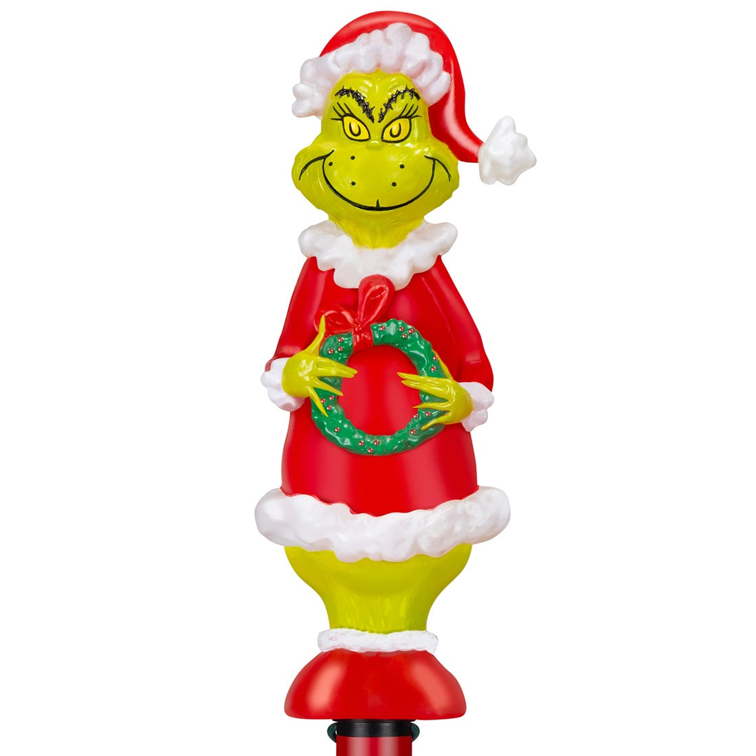 ight up pathways and landscape borders with these charming Grinch pathway stakes! This set of three stakes features 3D Grinch figures styled with Santa suits and wreaths. The set lights up in unison with bright white LED light. Place these Grinch pathway stakes anywhere you enjoy Christmas lights. Includes everything needed for easy outdoor setup. Features Outdoor LED 3D Grinch pathway stakes with green cord, set of 4 stakes. Lights up with bright white LED lights. Connect up to 18 sets end to end, electrical outlet required to plug in. Includes 5.5-ft electrical cord, requires outlet for plug in. Weather-resistant for indoor/outdoor use.