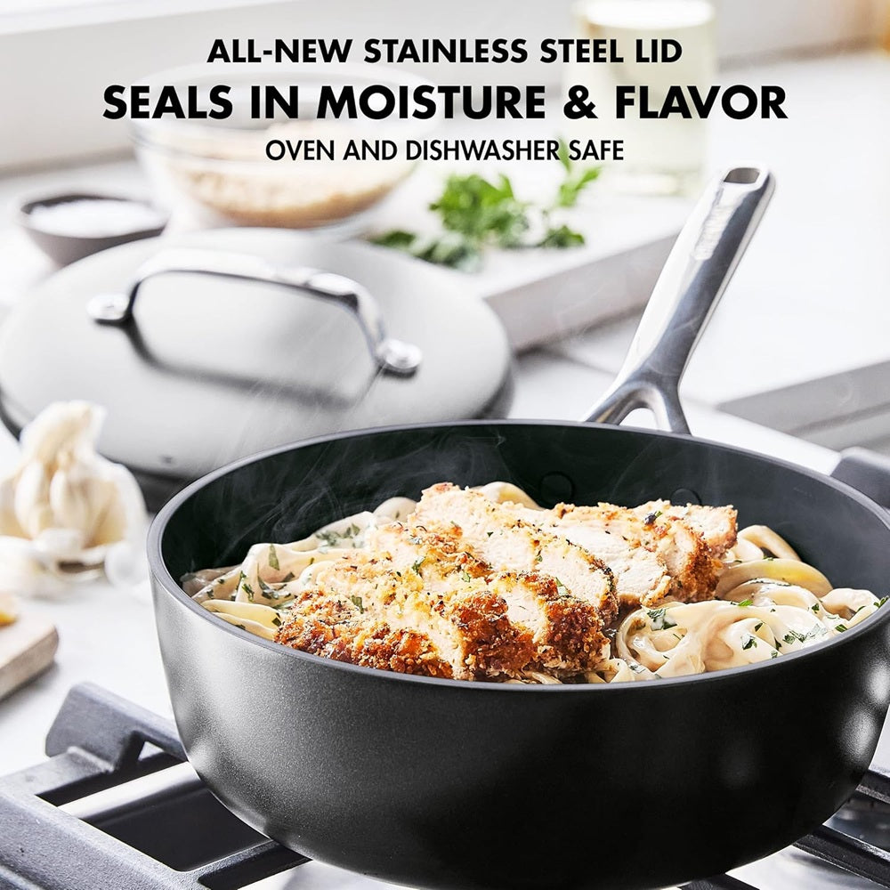 The GreenPan GP5 Hard Anodized Ceramic Nonstick 14-Piece Cookware Pots & Pans Set Black features Infinite8, the most state-of-the-art ceramic nonstick GreenPan has ever created, an ultra-durable coating with layers of diamonds for cutting-edge performance and durability, metal utensil safe. The 5mm hard anodized pans are metal utensil safe and deliver remarkable strength with next-level scratch resistance. Each frypan and saute pan have unique stay-flat bases designed to flex when heated, so oil stays where you put it and you can use less. These pans are optimized for quick and even heating on all stovetops, including induction, thanks to our innovative induction technology. Each pan’s polished stainless steel handle is reverse riveted to create a snag-free interior and eliminate food traps. Offer a sturdy, comfortable grip with a V-shaped cutout designed to stay cool on the stovetop. Oven and broiler safe up to 600 degrees F, this collection is built for serious home cooking and makes stovetop-to-oven cooking simple. The low dome lids are perfect for oven use and makes advanced cooking techniques simple. These pans are dishwasher safe for easy cleanup, but most messes will wipe clean. Includes: 9.5” and 11” frying pans, 3.25QT saute pan with lid, 3.25QT saucepan with lid, 5QT stock pot with lid, 3 pan protectors, silicone slotted spoon, silicone solid spoon, silicone spatula, Wonder Sponge.