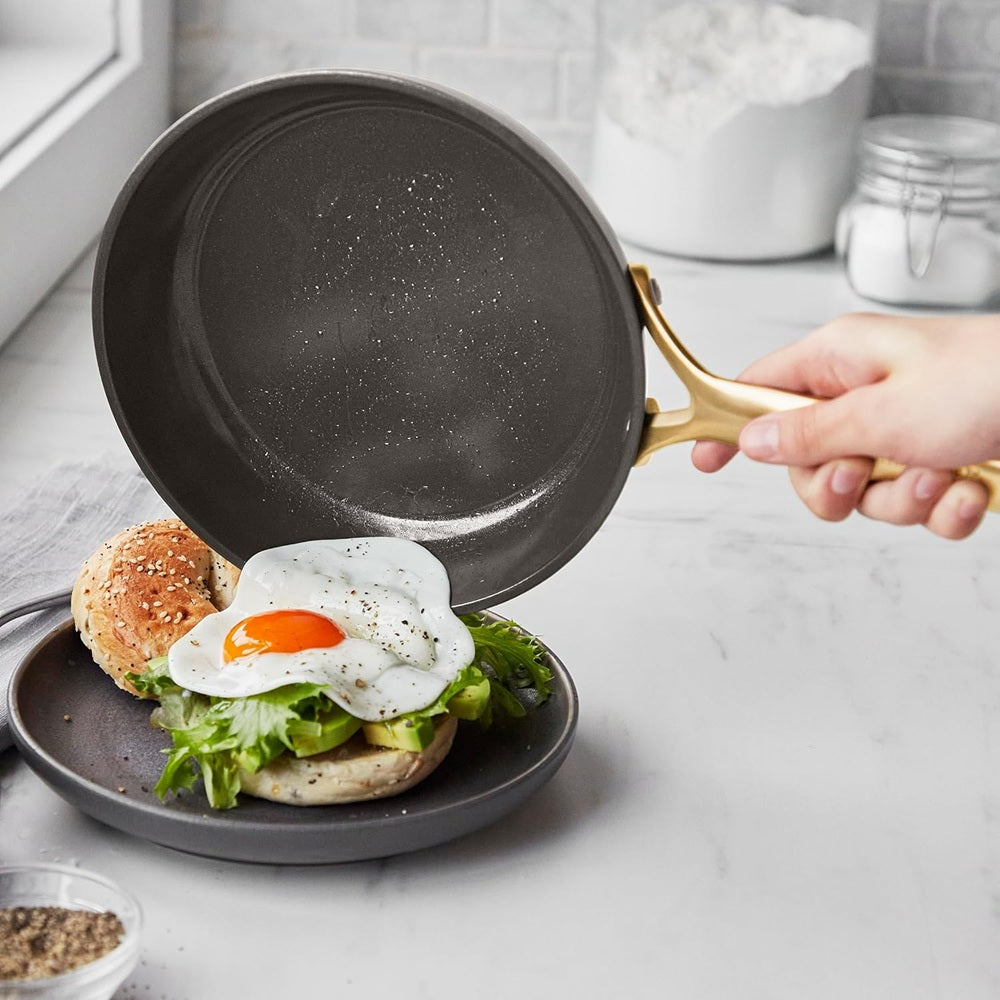 The GreenPan GP5 11-Piece Stainless Steel Ceramic Non-Stick Cookware Set in cocoa with gold handles. Made with the Infinite8, state-of-the-art ceramic nonstick GreenPan. The ultra-durable coating with layers of diamonds for cutting-edge performance and durability, metal utensil safe. These 5mm hard anodized pans are metal utensil safe and deliver remarkable strength with next-level scratch resistance. Each frypan and saute pan have unique stay-flat bases designed to flex when heated, so oil stays where you put it and you can use less. The cookware set are optimized for quick and even heating on all stovetops, including induction, thanks to our innovative induction technology. Each pan’s polished stainless steel handle is reverse riveted to create a snag-free interior and eliminate food traps. Offer a sturdy, comfortable grip with a V-shaped cutout designed to stay cool on the stovetop. Cookware set includes: 9.5” and 11” frying pans, 3.25QT sauté pan with lid, 3.25QT saucepan with lid, 5QT stock pot with lid, 3 pan protectors, silicone slotted spoon, silicone solid spoon, silicone spatula. Induction safe. The cookware set wipes clean, but is dishwasher-safe if needed.