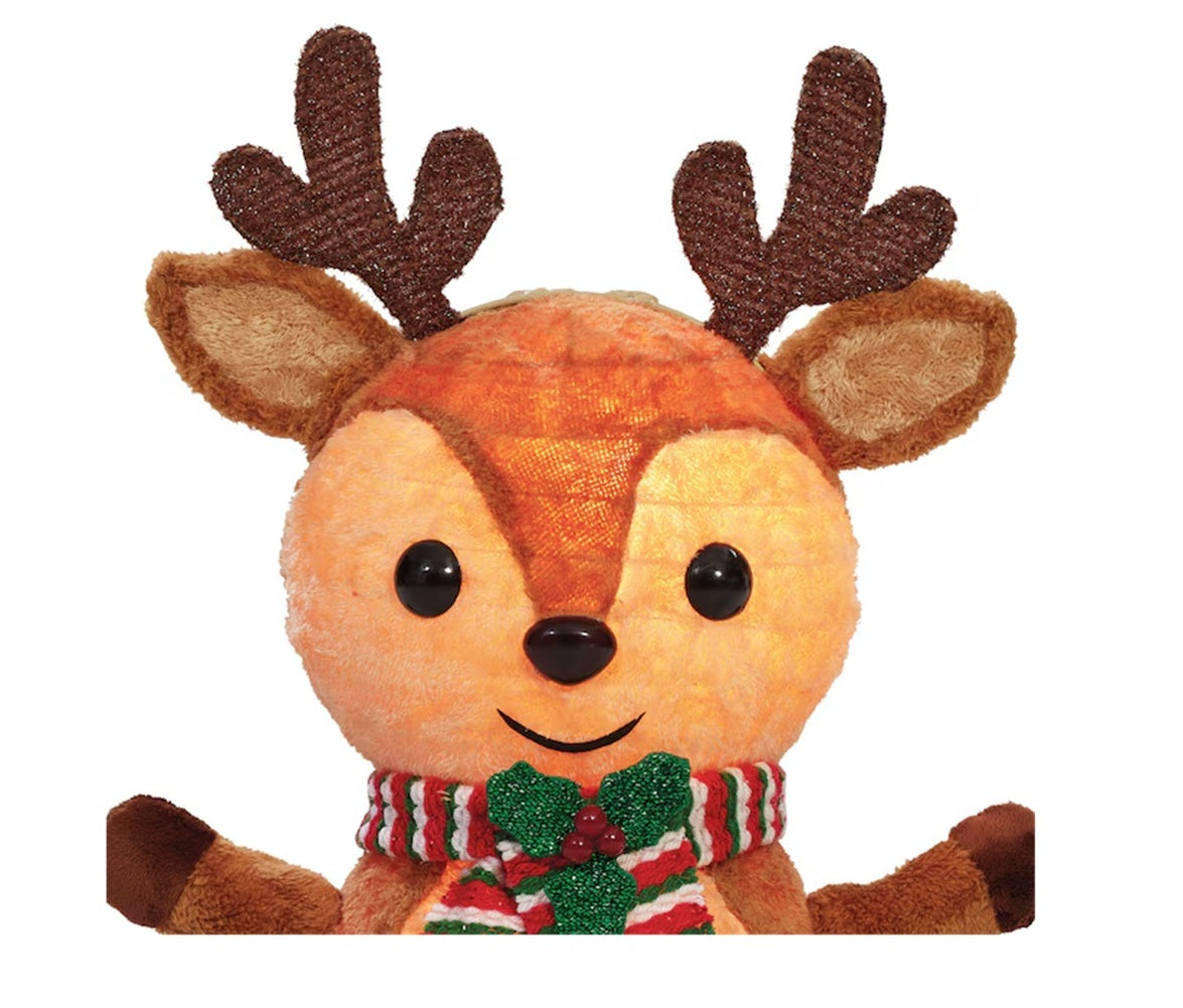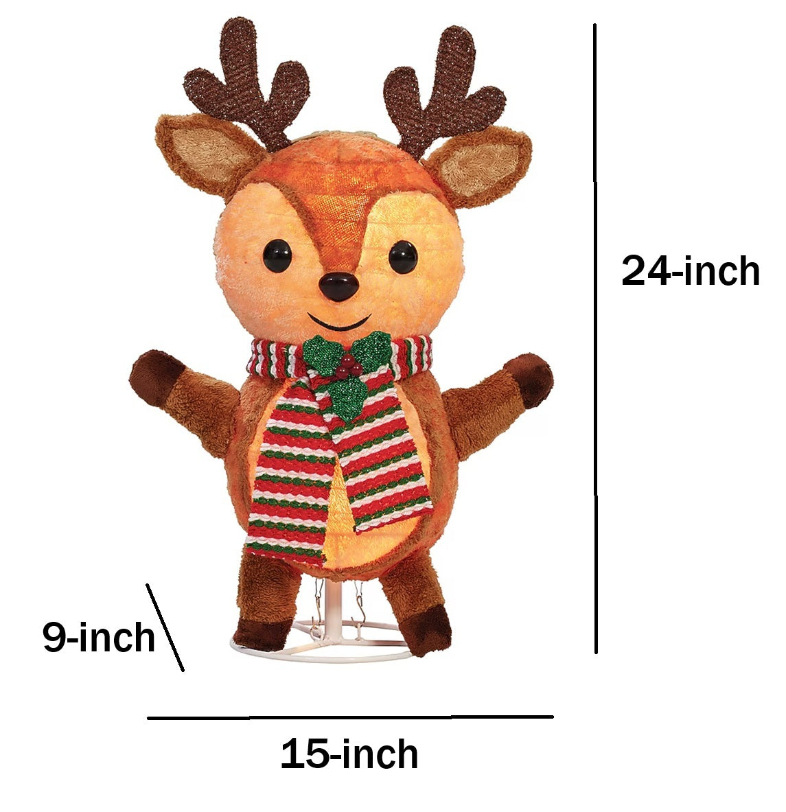 Bright colors, easy assembly and a fun holiday icon make this festive reindeer a fun addition to your holiday decorating. Set outdoors to accompany your holiday scene or indoors next to your tree or even on a table top. Features: Indoor or outdoor use. Two C7 warm white LED. Metal lawn stakes included. Knock down construction for easy assembly and storage. Five foot lead cord for ease of placement. Metal frame with weather resistant fabric cover. Measures 24" H X 15"L X 9"W