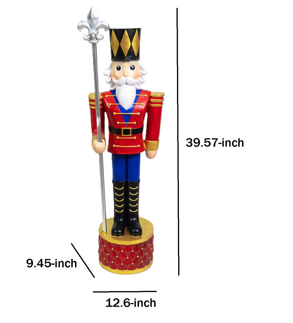The Holiday Living 3.2-FT Freestanding Traditional (Red) Nutcracker Holiday Decoration is a perfect stand alone or tabletop holiday decoration. The nutcracker is hand-painted in the traditional ted solider nutcracker uniform. It is made of durable resin, suitable for indoor or covered outdoor use. The elegant festive nutcracker icon is a great addition to your holiday decor. Set outdoors to make your holiday scene or indoors next to your tree or even on a table top. Features: Indoor or covered outdoor use. No assembly required, ships in one piece. Measures 39.57 inch H X 12.6 inch L X 9.45 inch W
