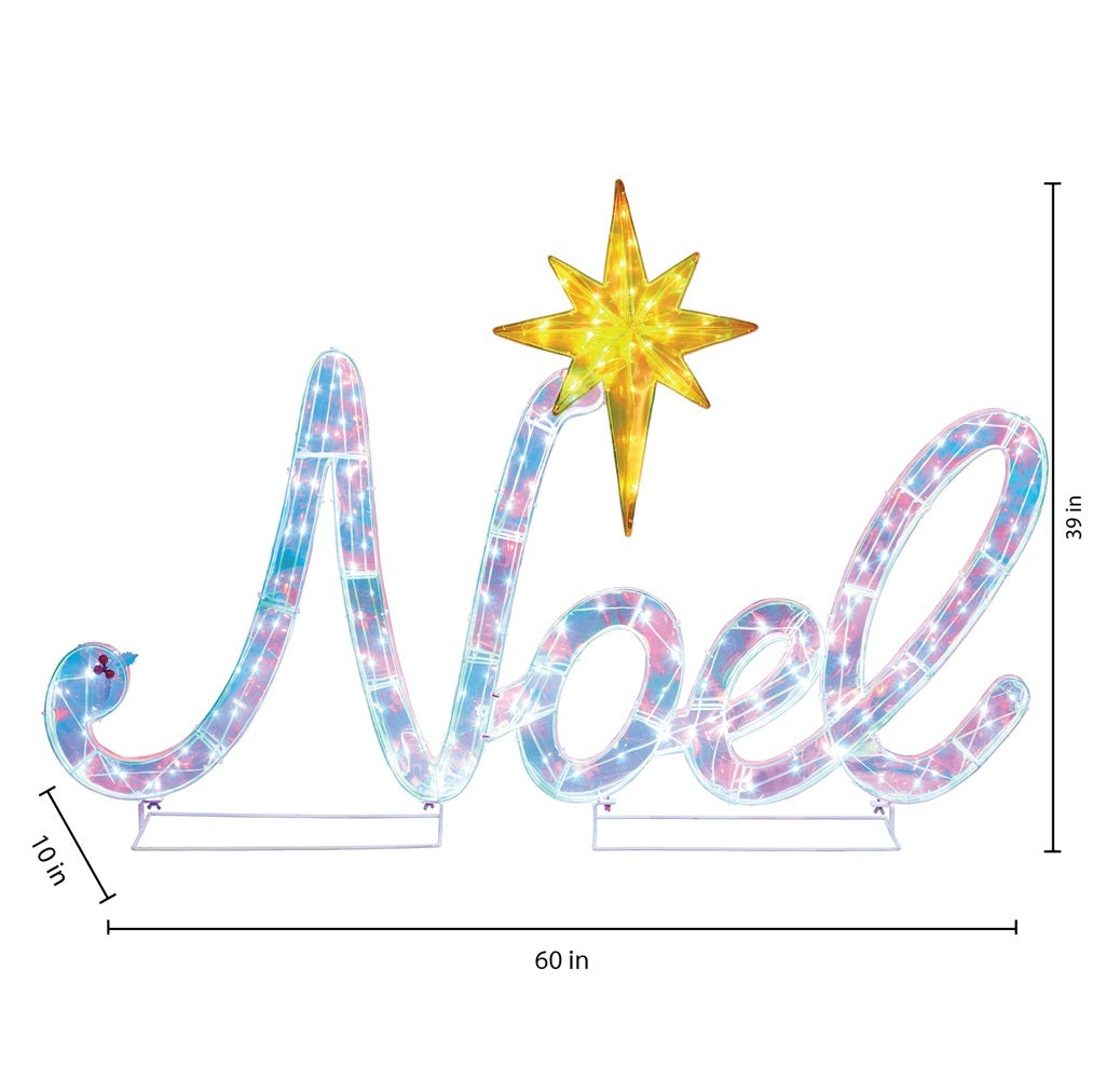 Prismatic Noel lighted sculputre to spread holiday greetings. Weather resistant prismatic fabric shimmers in the daylight and shines brightly at night thanks to full illunimation. Sure to bring comfort and joy to your holiday display. Lit with 170 cool white/warm white LED lights twinkle effect. cETLus approved adaptor. Metal lawn stakes included. Indoor or outdoor use. Dimensions: 60in X 10in X 39in (with base)
