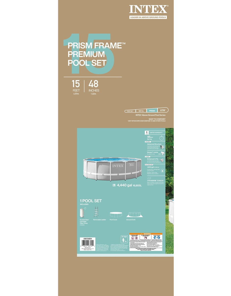 Enjoy hours of outdoor fun with the Intex Prism Frame 15ft X 48in pool. It is constructed with puncture-resistant 3-ply durable material. It features all of the great benefits of Metal Frame pools, and are enhanced with strong powder-coated steel tubing and stylish and upscale looking liner color. Hydro Aeration® Technology is incorporated into the cartridge filter pump providing improved circulation and filtration, improved water clarity, and increased negative ions at the water surface. Follow these 3 steps for easy assembly. 1) Lay out the liner for your pool on flat, level ground. 2) Assemble the frame for your pool. 3) Fill your pool with water and enjoy. It comes with a 1,000 gal cartridge filter pump, ladder. Water capacity is 4,440 gallons (90%) and it is ready for water in 45 minutes. Maintenance kit includes a vacuum head with 1-piece cleaning head, surface skimmer, 94-inch telescoping aluminum pole, mesh net attachment, and reusable debris bag.