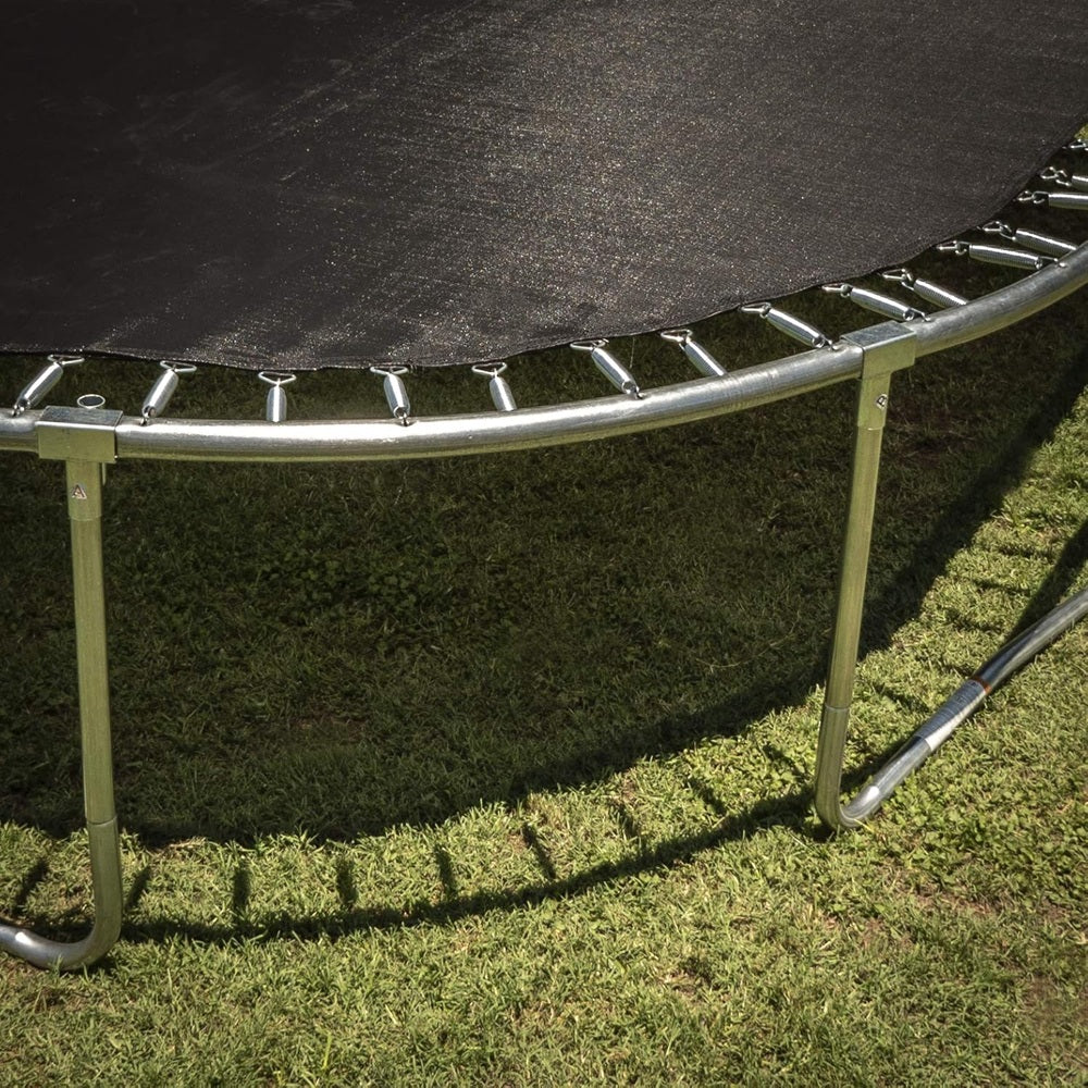 This trampoline jumping surface is a replacement for 10FT X 15FT oval trampoline with 84 v-rings and 6 in. springs. This jumping surface consists of polypropylene for weather resistance. Each jumping surface has four rows of stitching and v-rings measuring 4.5 mm. Please see the graphics to determine the correct size of your trampoline parts in order to ensure correct jumping surface. Determine the size of your trampoline by measuring the diameter of the trampoline frame. Take the measurement from the outside edge of one top rail to the outside edge of the exact opposite top rail. Please remember when measuring your springs to measure an unstretched or undamaged spring. Measure the complete spring from hook end to hook end.
