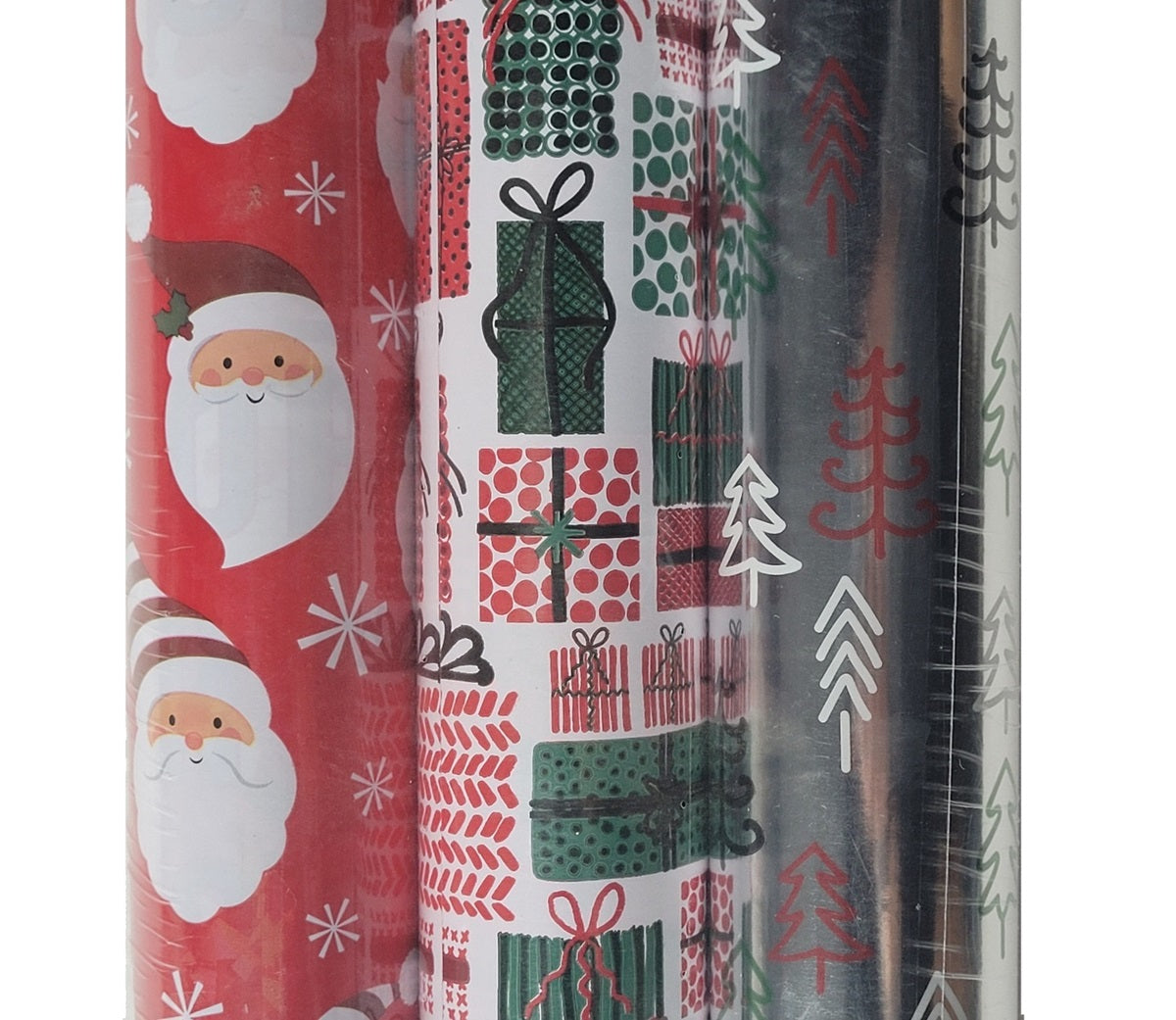 The Kirkland Double-Sided Gift Wrap 3 Rolls Christmas Wrap 270 sq ft Silver Trees/Red Santa/White Presents features modern novelty designs in Christmas silver, red and white. The Kirkland Double-Sided Gift Wrap 3 Rolls Christmas Wrap 270 sq ft Silver/Red/White features a contemporary Christmas wrapping paper pack featuring a decorative festive Santa face in red, paired with Ho Ho Ho white, red, silver tones on a foil finish on the reverse. It includes a white traditional paper with red and green presents, paired with a red paper and Santa with snowflakes. A foil silver wrap with red, green, black and white Christmas tree, paired with red, black, silver, and green stripes on the reverse. Features: 6 designs per pack – 3 rolls with reversible print. 270 sq ft total per pack. 90 sq ft each roll. Each roll 39.5 ft x 2.28 ft.
