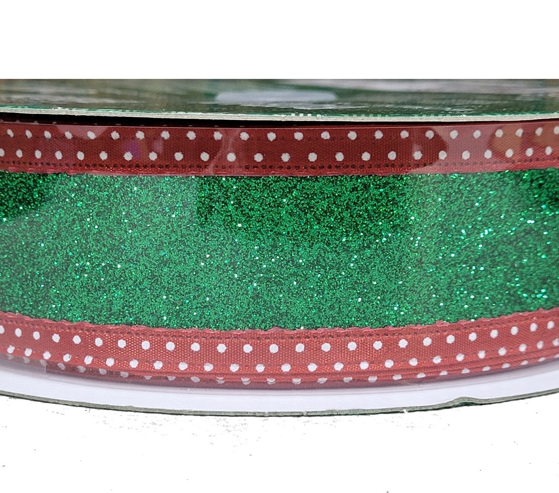 The Wire-Edged Green Glitter Ribbon with Red & White Dot Edges 50 yards X 1.5 inches is beautiful spool of ribbon will create beautiful bows for your Christmas gifts or to adorn your Christmas tree, mantle or stairway. This premium stylish holiday ribbon has been carefully selected. This polyester green glitter ribbon is decorated with red edges with white dots with its high-quality, finish-stitched edges. Made from the fine polyester fabric, finely woven and lasts a long time. The ribbon is wire-edged perfect for crafts, gift packaging, and more. 1.5-inch width X 50 yards length.