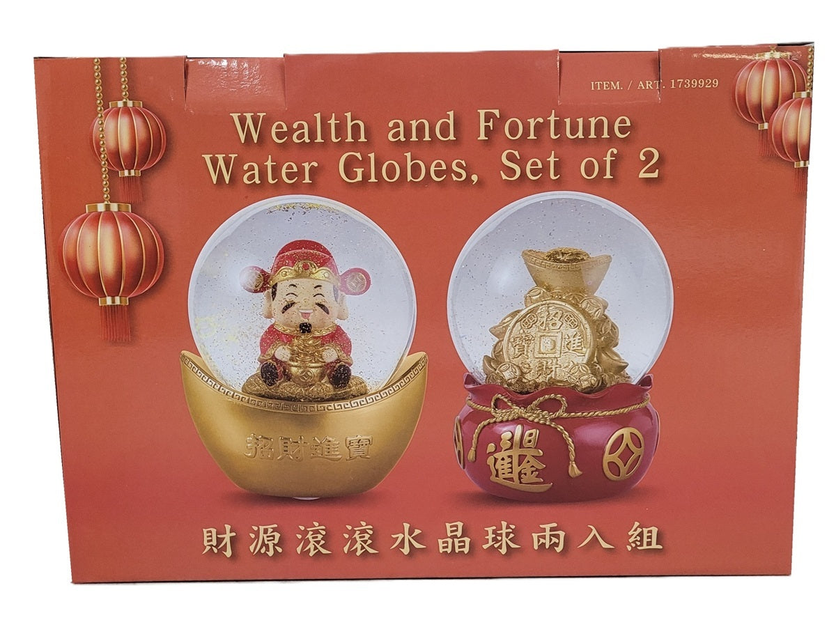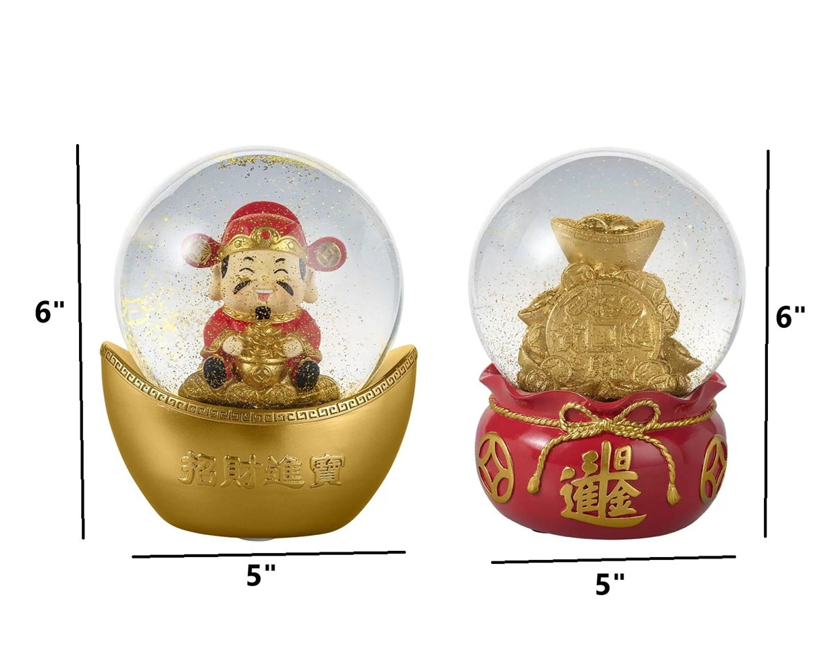 Experience the magic of Lunar New Year with this enchanting set of two water globe decorations, a must have for your new year decoration. Impeccably designed with traditional Lunar New Year elements and adorned with exquisite hand painted details, these decorations promise to bring joy and good fortune to you and your loved ones. Each water globe, filled with shimmering glitter that swirls in water when shaken, creates a mesmerizing and auspicious display, ensuring your home is filled with blessings and prosperity for the entire new year. Each water globe measures 6"H X 5"L X 4"W