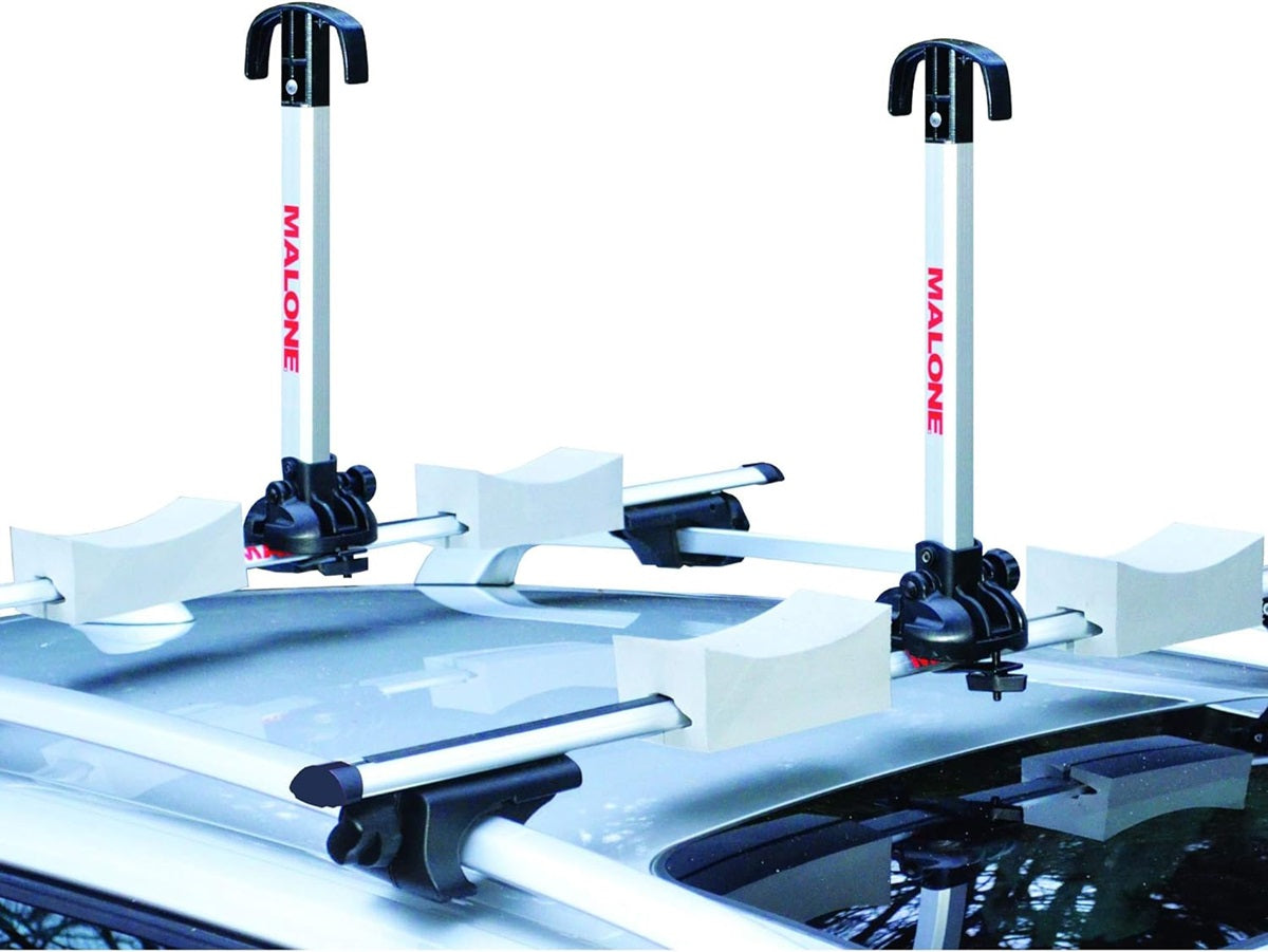 The Stax Pro2 from Malone provides an efficient, economical, and safe way to transport two kayaks on factory oval or aftermarket round or square load bars. The Stax Pro2 system features a set of octagonal aluminum posts that mount directly to the rooftop load bars to support the boats, as well as stacker blocks to cradle and stabilize the boats on the bars, 12-foot load straps to secure the boats to the posts, and 12-foot tie downs to secure the boats at their bows and sterns. Thanks to universal-fit JAWS mounting hardware, the posts install to the load bars without tools. Built for a lifetime of use, the aluminum posts and their injection-molded nylon platforms are rust resistant. The posts fold down easily for low clearance and to improve fuel economy when the system is not in use. The foam stacker blocks cradle the boats to both absorb road shock during transit and to stabilize the boats during transport. The combination of sturdy, cam-style H.D. polypropylene load straps and bow and stern tie-downs keeps the boats wobble-free on the road. The Stax Pro2 system comes with all hardware, straps, safety tie-downs, and blocks to carry two kayaks. With additional straps and padding, this carrier can be used to transport up to four boats, stacked side by side, on virtually any vehicle or trailer cross rail system.