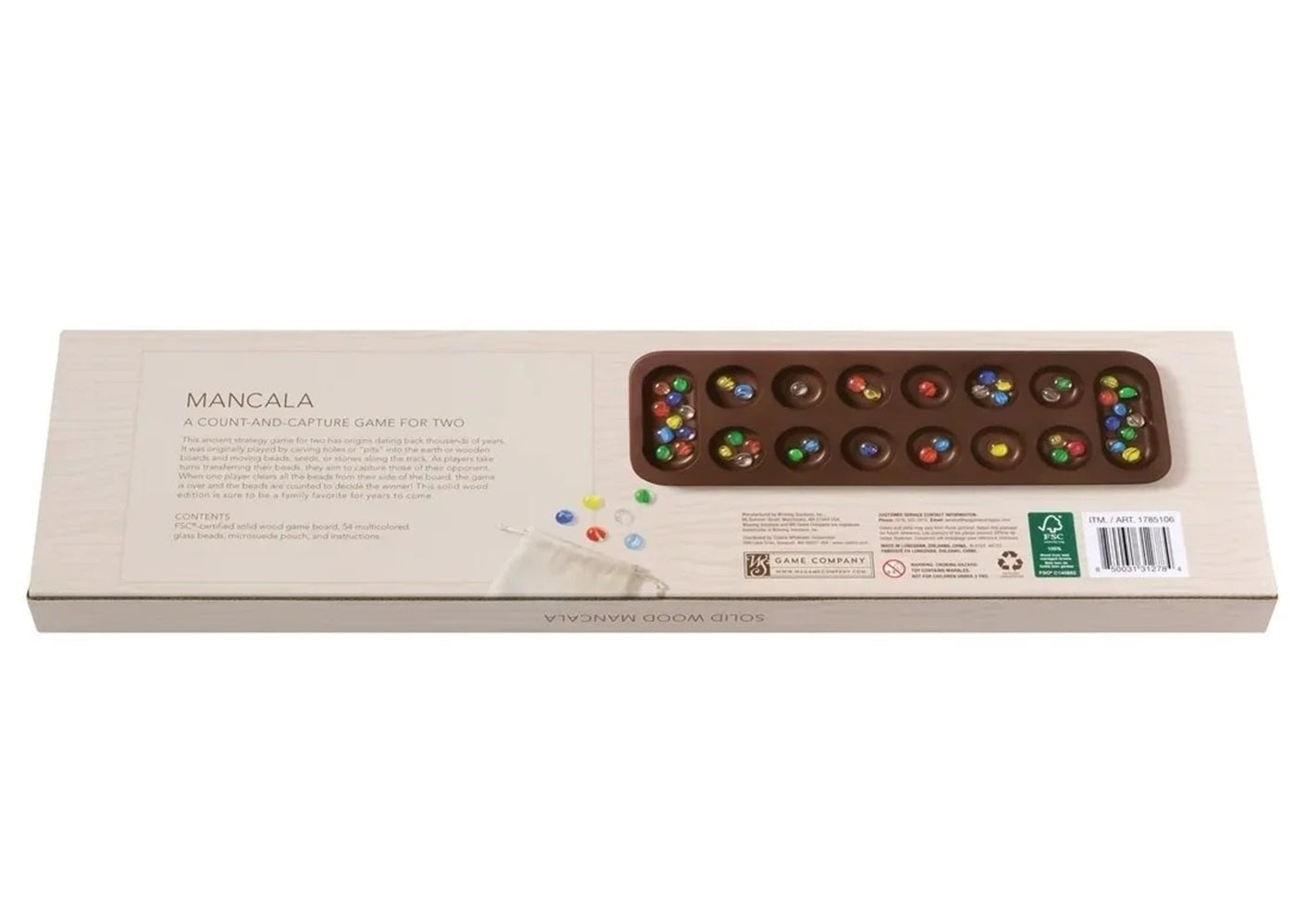 The Mancala - A Count-and-Capture Game for Two is an ancient strategy game for two has origins dating back thousands of years. It was originally played by carving holes or "pits" into the earth or wooden boards and moving beads, seeds, or stones along the track. As players take turns transferring their beads, they aim to capture those of their opponent. When one player clears all the beads from their side of the board, the game is over and the beads are counted to decide the winner! This solid wood edition is sure to be a family favorite for years to come. Contents: (1) solid wood game board, 54 multicolored glass beads, microsuede pouch, and instructions. For ages 8 and older.