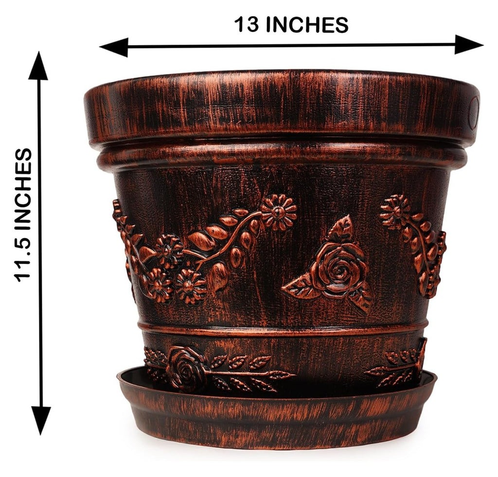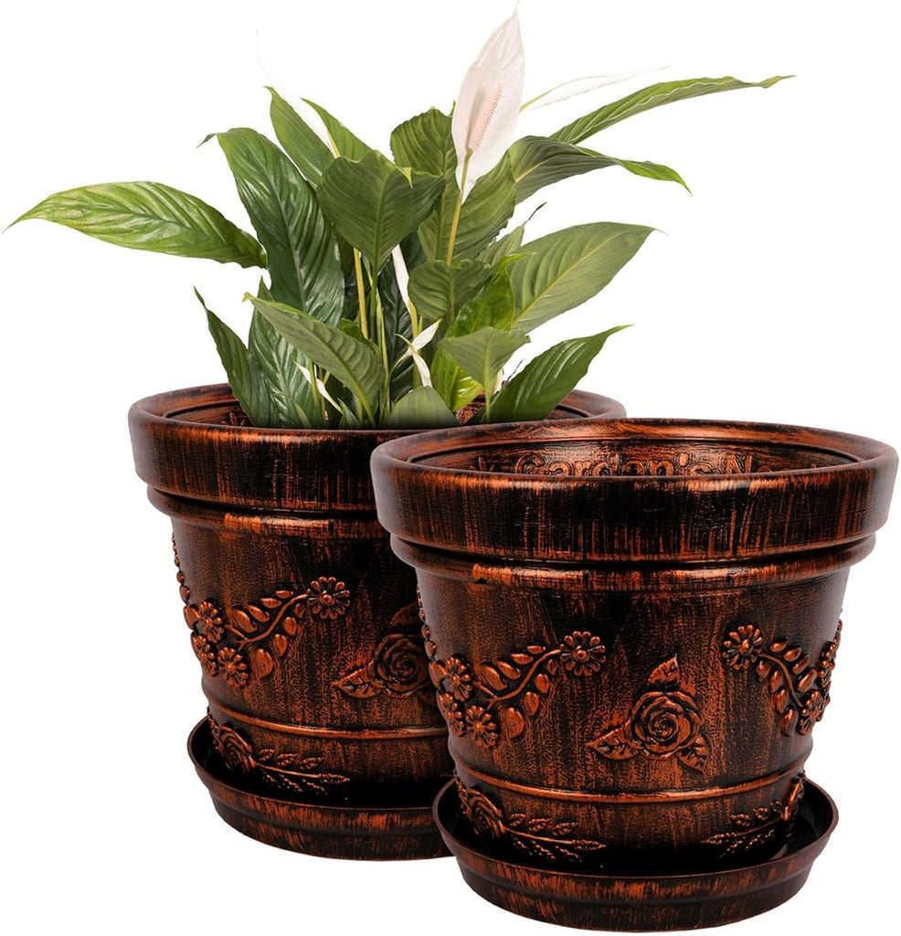 2-Pack Gardens Need 13inch plastic, round flower pot with matching tray in antique bronze 2-pack provides excellent drainage. Perfect for home, office, table, and balcony. These pots are crafted from durable materials that will last for years. Crafted from high-quality plastic material, these pots are built to last, providing durability and ensuring long-lasting use. Elevate the allure of your garden...