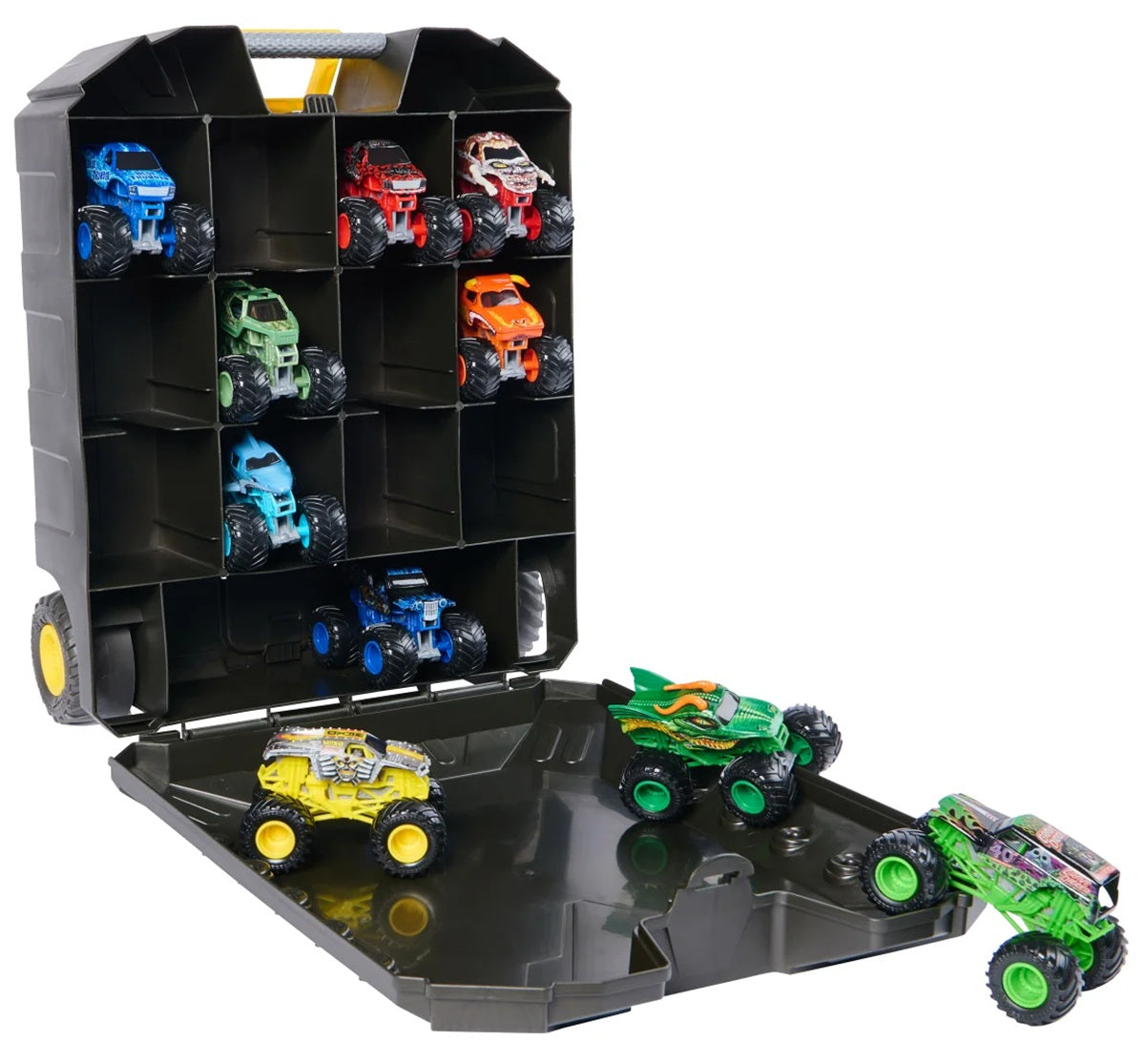 This awesome Pit Party & Go storage case comes with 10 fan favorite Monster Jam Trucks and fits up to 15 of your favorite 1:64 scale Monster Jam trucks! There’s also a large space at the bottom that can hold 3 trucks. With an extendable handle and rolling wheels, this sturdy case is ready for epic Monster Jam action, anywhere! The Monster Jam Carrying Case is a great gift for kids aged 3 and up. Load your favorite 1:64 scale Monster Jam trucks inside and take them anywhere with the Carrying Case! Includes: (1) Carrying Case, (10) 1:64 Scale Monster Jam Trucks: (1) Grave Digger, (1) Son Uva Digger, (1) Megalodon, (1) Dragon, (1) El Toro Loco, (1) Zombie, (1) Max D, (1) Soldier Fortune, (1) Northern Nightmare, (1) Blue Thunder.