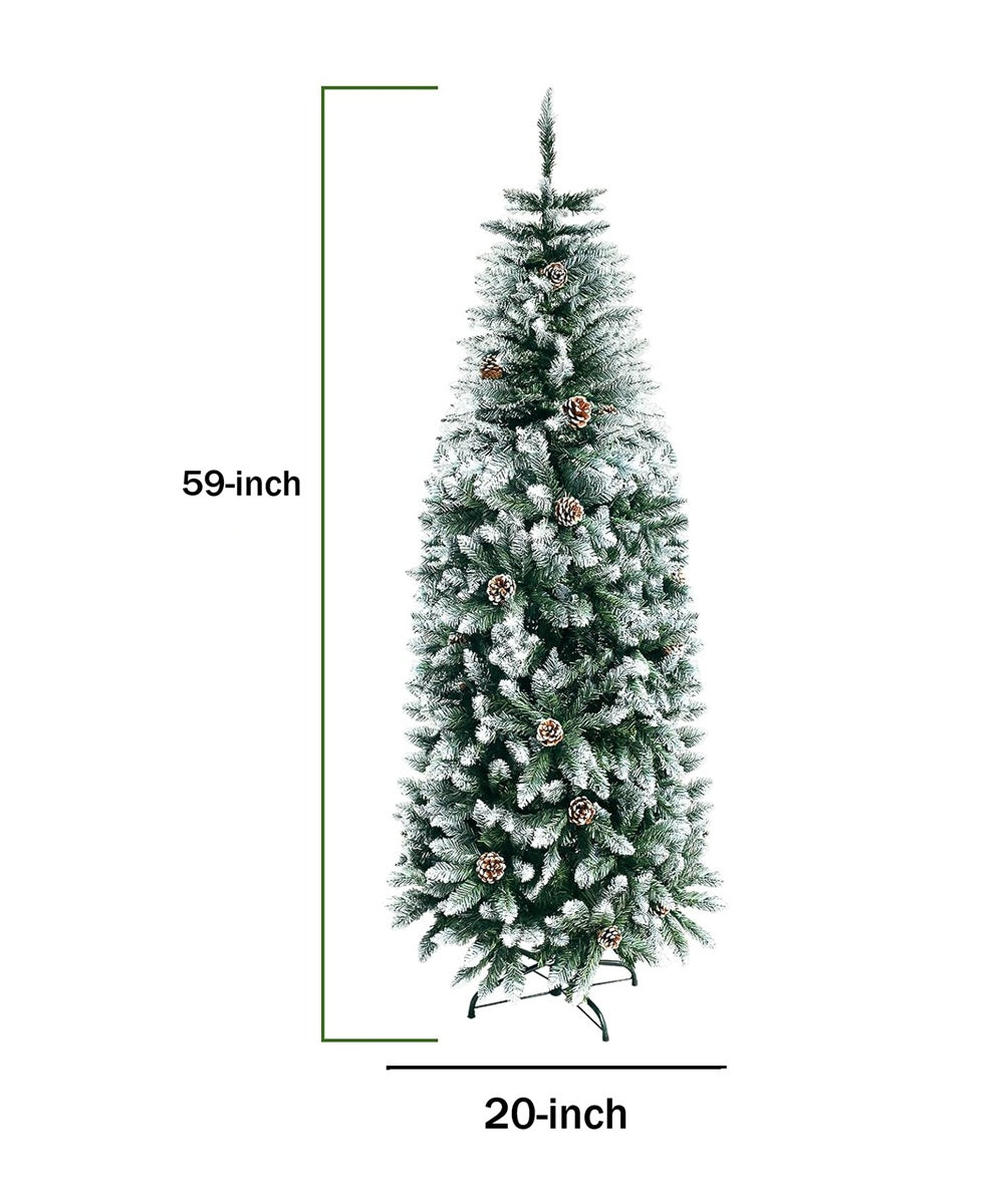 Add elegance to any room with the Mupera 5FT Snow Flocked Slim Artificial Christmas Tree with Metal Stand. The slim pencil Christmas Tree features a special flocked snow design that creates a unique wintry feel, bringing the snowy atmosphere indoors. The addition of 28 pinecone decorations adds realism and enhances the overall look of the tree. With 400 branches, our artificial pencil tree offers a full-bodied look that is perfect for hanging all your favorite decorations. It will remain green and vibrant season after season, providing long-lasting beauty and joy. Crafted from high-quality PVC leaves, our pencil artificial Christmas tree is environmentally friendly and built to last. The metal bottom provides stability and durability, ensuring that the tree stays upright and has excellent anti-crush capacity. The slim pencil tree is ideal for decorating any space, including homes, offices, and classrooms. Its slim design allows for easy placement in any room, and it can even be used outdoors. Create a festive and joyful atmosphere anywhere you desire. The Christmas tree slim consists of multiple parts including hinged sections and a base. You can just follow the instructions to complete the assembly quickly.