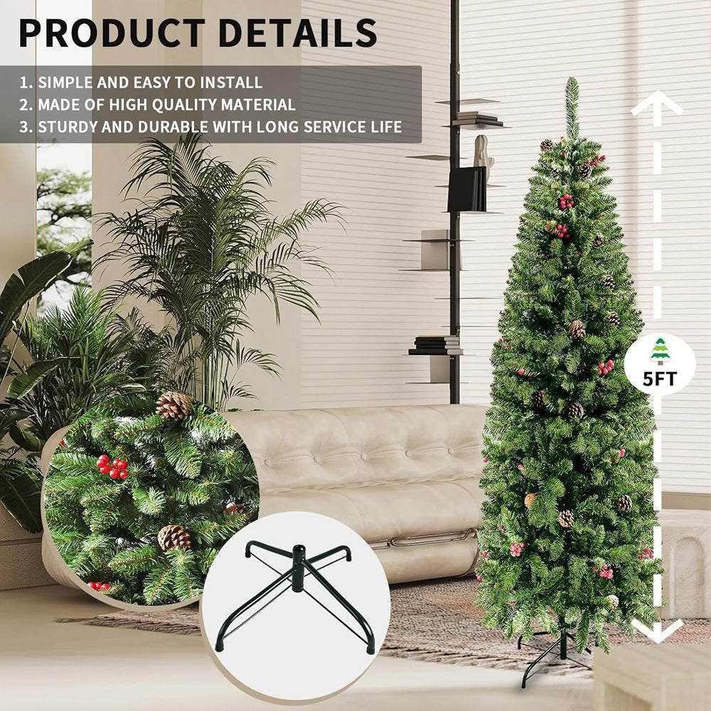 Add elegance to any room with the MuRealy 5FT Pencil Slim Artificial Christmas Tree with Pinecones and Metal Stand. The Pencil Christmas Tree features 300 branch tips, creating a lush and full appearance that closely resembles a real tree. The addition of pine cones and red berry clusters among the branches adds a vivid and attractive touch, bringing the wintery feel indoors. The artificial Christmas tree is designed for quick and easy setup, allowing you to spend less time assembling and more time enjoying the holiday season. The hinged branch design simplifies installation, while the included foldable stand ensures stability and hassle-free setup. Crafted from 100% new PVC materials, our artificial Christmas tree guarantees durability and longevity. The high-quality PVC leaves ensure a lifelike appearance, making it difficult to distinguish from a real tree. With its slim and compact design, our slim Christmas tree is perfect for smaller spaces such as apartments, and offices, or even as a secondary tree for additional holiday decor. It provides all the festive charm of a traditional Christmas tree for a bedroom while saving valuable floor space. Measures 59-in H X 20-in D