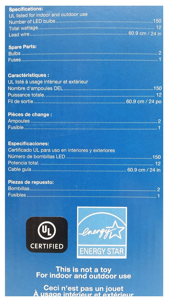 The Net-Style Tangle Free 150-Count LED Warm White Lights 6' x 4' are the fast and easy way to decorate trees, hedges, bushes and more in just minutes. They are simple and easy to use. Lights feature 150 LED bulbs in warm white. "Warm clear" also known as "warm white" has a soft natural incandescent glow similar to candlelight. Dimensions: 4 ft. x 6 ft. Total lighted area: 24 sq. ft. LED lights use 90% less energy. Durable, non-glass replaceable bulbs are cool to the touch. UL listed for indoor or outdoor use. 150 LED Lights, Total Wattage 12. Lead Wire: Green, 24 inches. Energy Star. UL Certified.