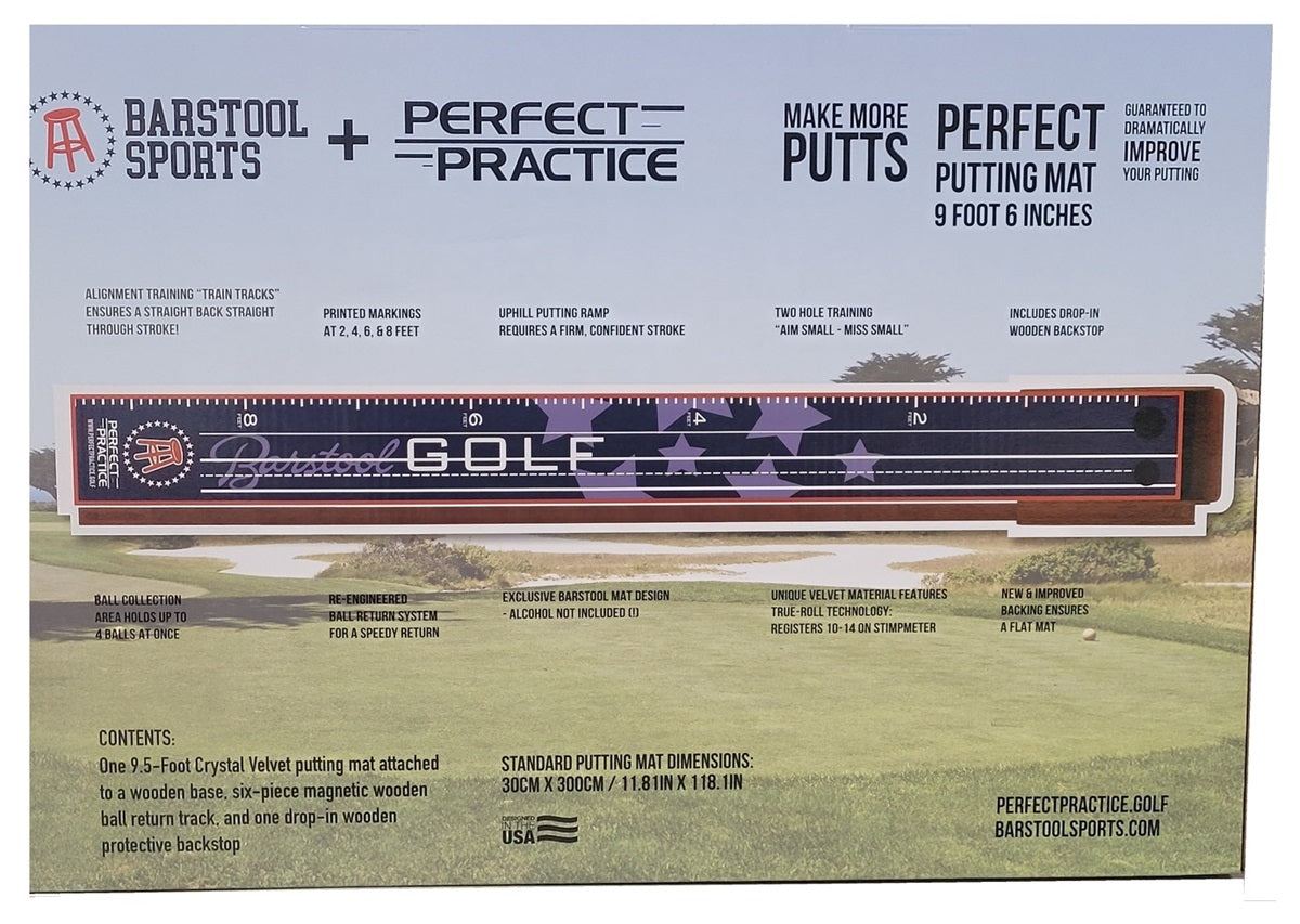 Barstool Sports Perfect Putting Mat Navy is trusted and used by over 100 PGA Tour Pros including the official putting mat of former Dustin Johnson. This special edition mat is custom-printed with Barstool Golf logo with stars in navy. The mat is enclosed by a classy, natural wood frame and also features an automatic ball return for added convenience. Rolls up for storage and portability. Features: 10-14 Stimpmeter speed (dependent on underlying surface). Auto Ball Return. Drop in Back Stop. Rolls up for storage and portability.