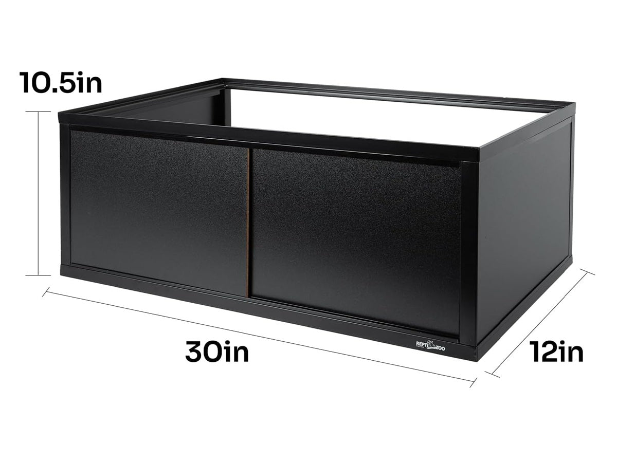 The REPTI ZOO Deluxe Terrarium Stacker with Front Sliding Doors 30" W X 12" D X 10.5" H is used to stack two tanks, suitable for front opening tanks, not for top opening tanks. The frame is made of steel and this stacker can support 600LB. Size of this stacker is 30" wide and 12" deep, thus it is suitable for stacking 30"W and 12"D tanks. The sacker is hollow design and can store reptile accessories such as bulbs, food, wire, and others. The height is 10.5" and enough space for light fixtures and more.
