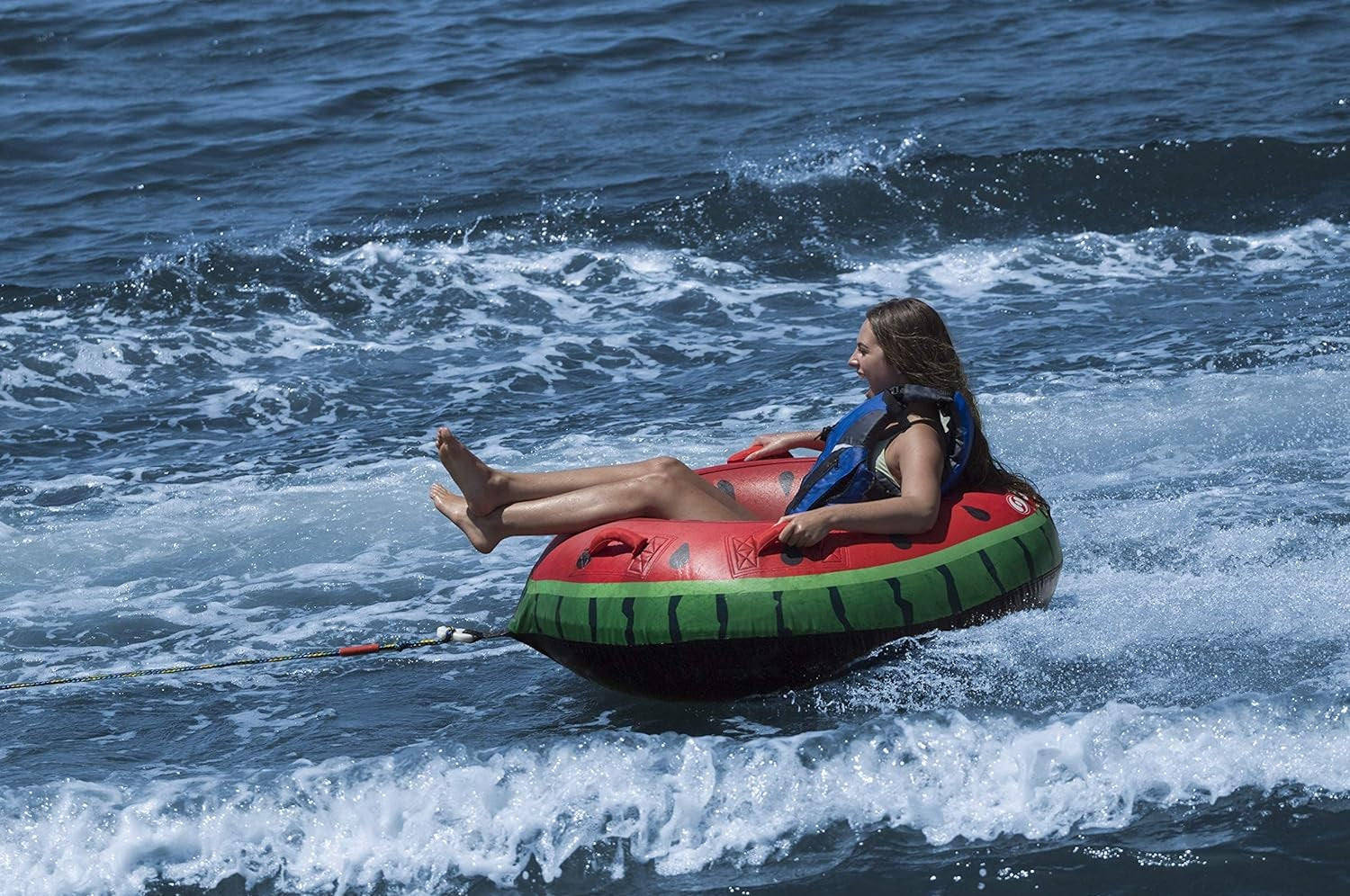 You know it's summertime when you enjoy a delicious slice of watermelon. Now you can eat some watermelon while tubing on your inflatable watermelon towable tube. Life is sweet and so is the summertime, so you might as well spend those hot days chillin' on a cold slice of watermelon. This raft is great for tubing on the lake with friends. It's constructed of thick, heavy duty vinyl and adds a slice of fun to your water festivities. Make a splash this summer on the inflatable watermelon towable tube. It's one in a melon and sweet for all. Suitable for ages 13 years and up. Weight capacity of 170 lbs. WARNINGS: Always wear a properly fitted life jacket. Never exceed 20 MPH (32 km/h) for adults. 15 mph (24 km/h) for children. Never tow more than one tube at a time, or use tube as a personal floatation device. Always ensure tow rope is clear of all body parts prior to and during use.