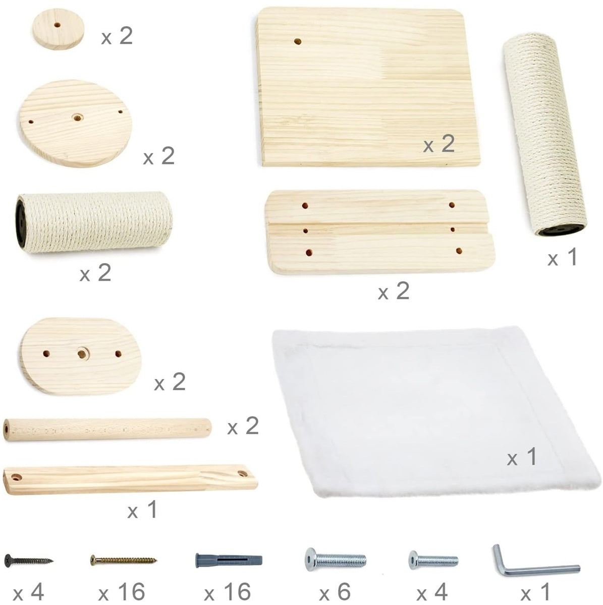 • Cat shelf set is made of natural wood, sisal and cozy faux fur bed mat.
