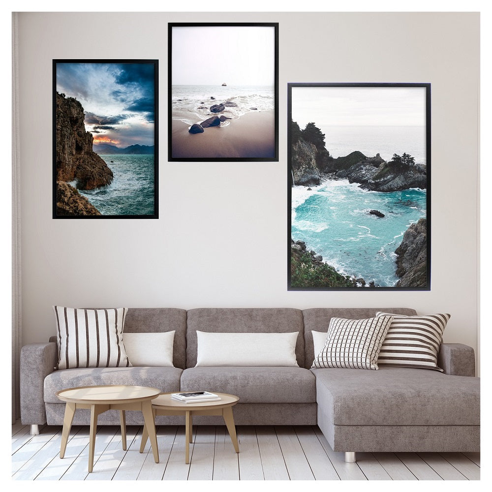 Transform your favorite photos or posters into works of art with the Threshold Poster Frame Black 27x40 - Set of 4. This black photo frame is a generous size, perfect for posters or 27" x 40" pictures. The black hue is nice and neutral and sets off the wall art from the wall with a little pop of color. The plastic Polystyrene construction is durable and can withstand a bit of abuse. Give a room a great, inexpensive new look with framed posters. Product Details: Holds one photo 27" x 40". Outside Dimensions: 28.5" W x 41.5" L x .63" D. Sawtooth Back. Frame Display: Horizontal or Vertical. Material window glazing: Plexiglass. Great for movie posters, prints, art prints and photo. Hangs horizontal or vertical.