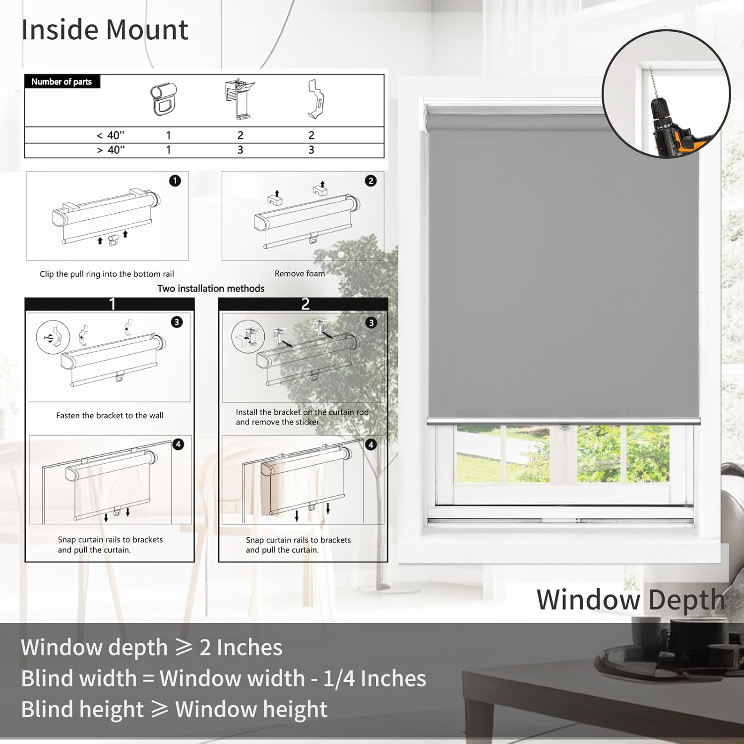 • Choose a Correct Size: INSIDE MOUNT: Blind Width = Window Width - 1/4 Inches. OUTSIDE MOUNT: Blind width = Window Width +4". Fabric width will be 0.8" narrower than the size of the blind.